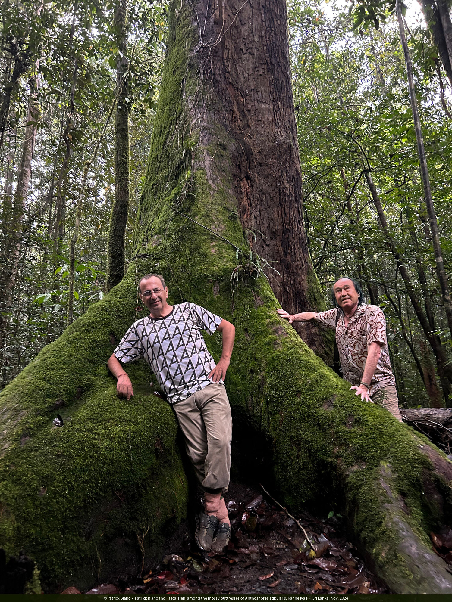 Patrick Blanc and Pascal Héni among the mossy buttresses of Anthoshorea stipularis, Kanneliya FR, Sri Lanka, Nov. 2024