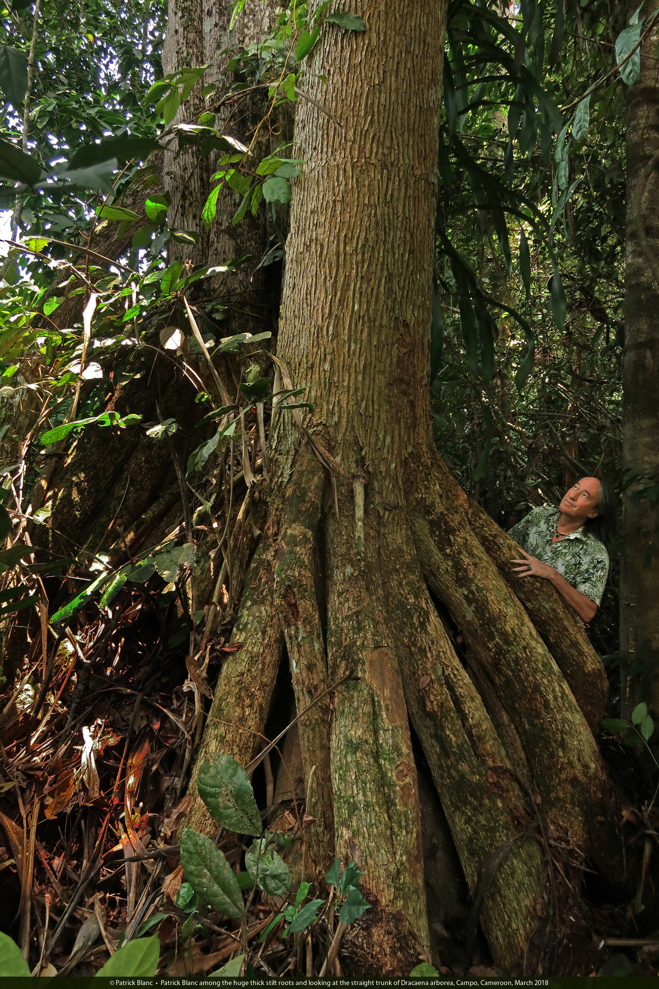 Patrick Blanc among the huge thick stilt roots and looking at the straight trunk of Dracaena arborea, Campo, Cameroon, March 2018
