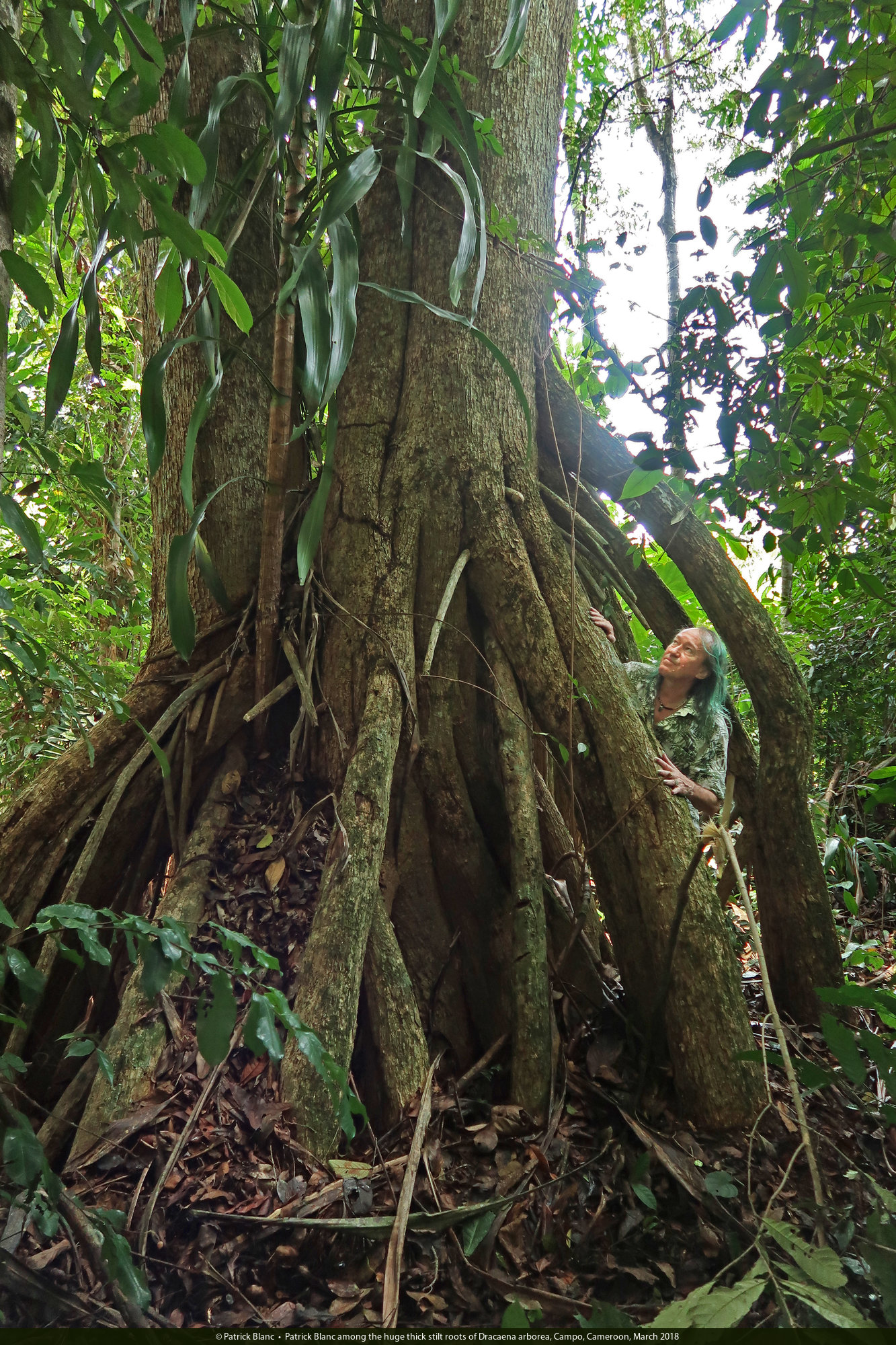 Patrick Blanc among the huge thick stilt roots of Dracaena arborea, Campo, Cameroon, March 2018