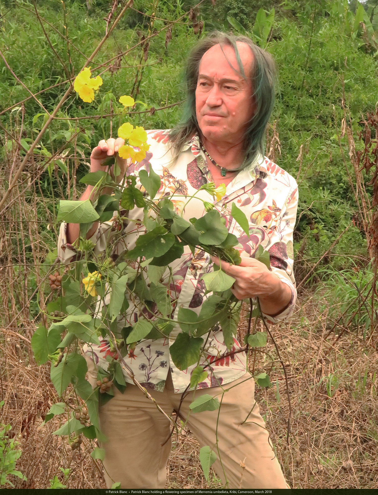 Patrick Blanc holding a flowering specimen of Merremia umbellata, Kribi, Cameroon, March 2018