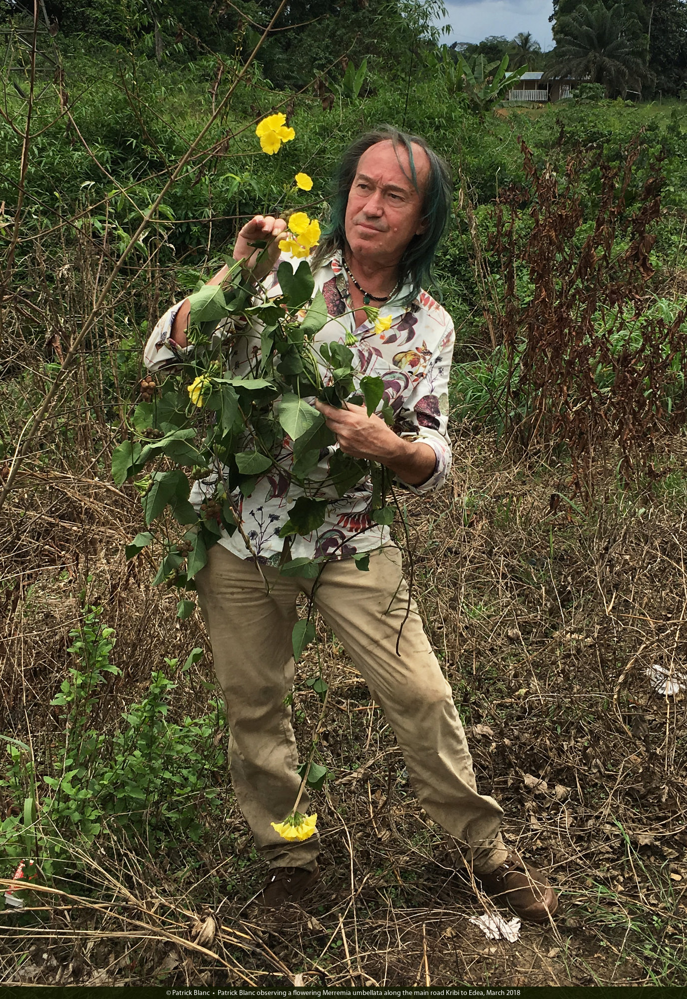 Patrick Blanc observing a flowering Merremia umbellata along the main road Kribi to Edea, March 2018