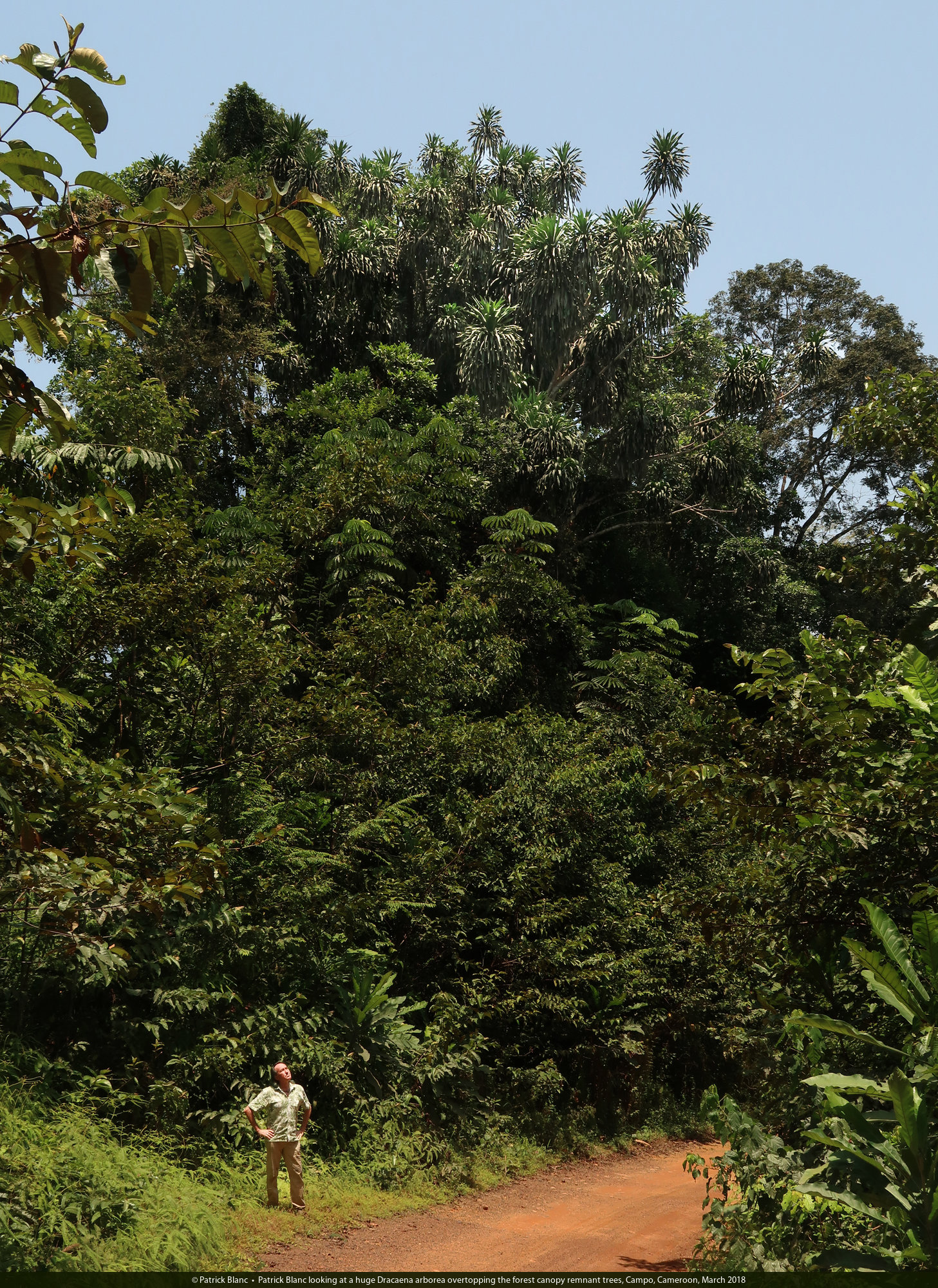 Patrick Blanc looking at a huge Dracaena arborea overtopping the forest canopy remnant trees, Campo, Cameroon, March 2018