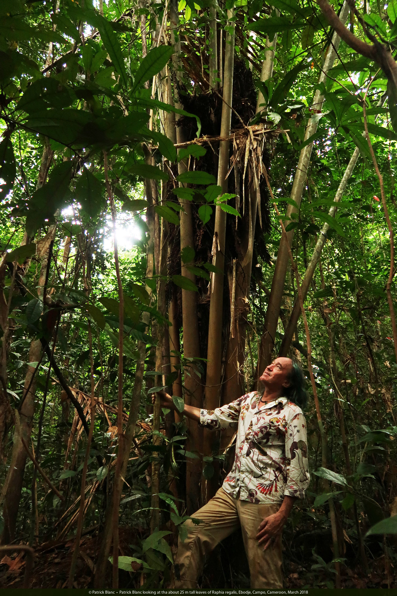 Patrick Blanc looking at tha about 25 m tall leaves of Raphia regalis, Ebodje, Campo, Cameroon, March 2018