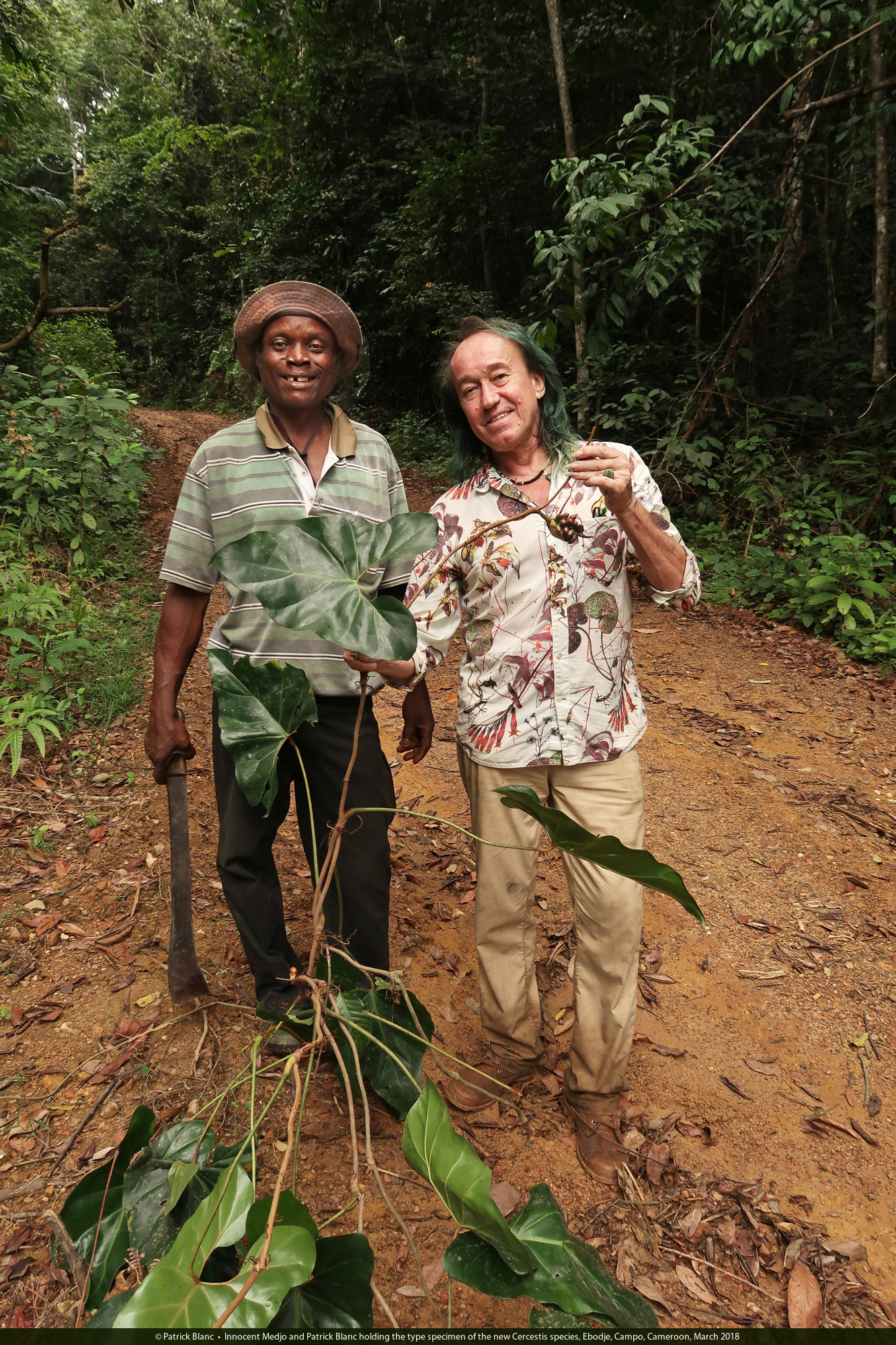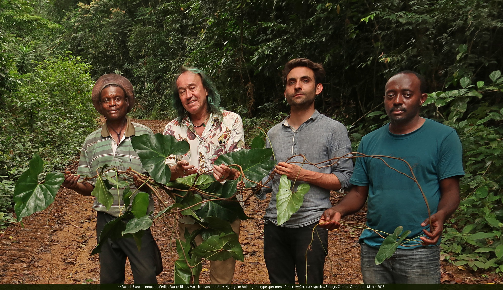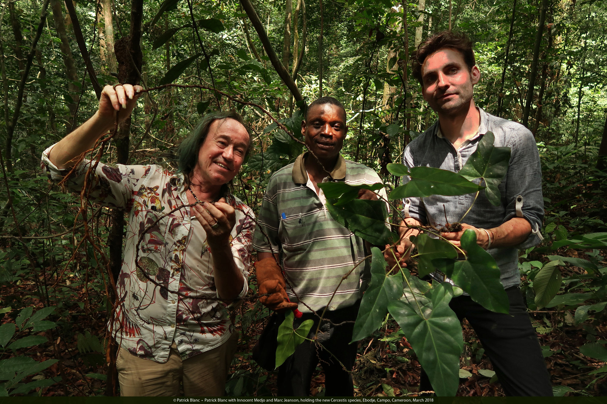 Patrick Blanc with Innocent Medjo and Marc Jeanson, holding the new Cercestis species, Ebodje, Campo, Cameroon, March 2018