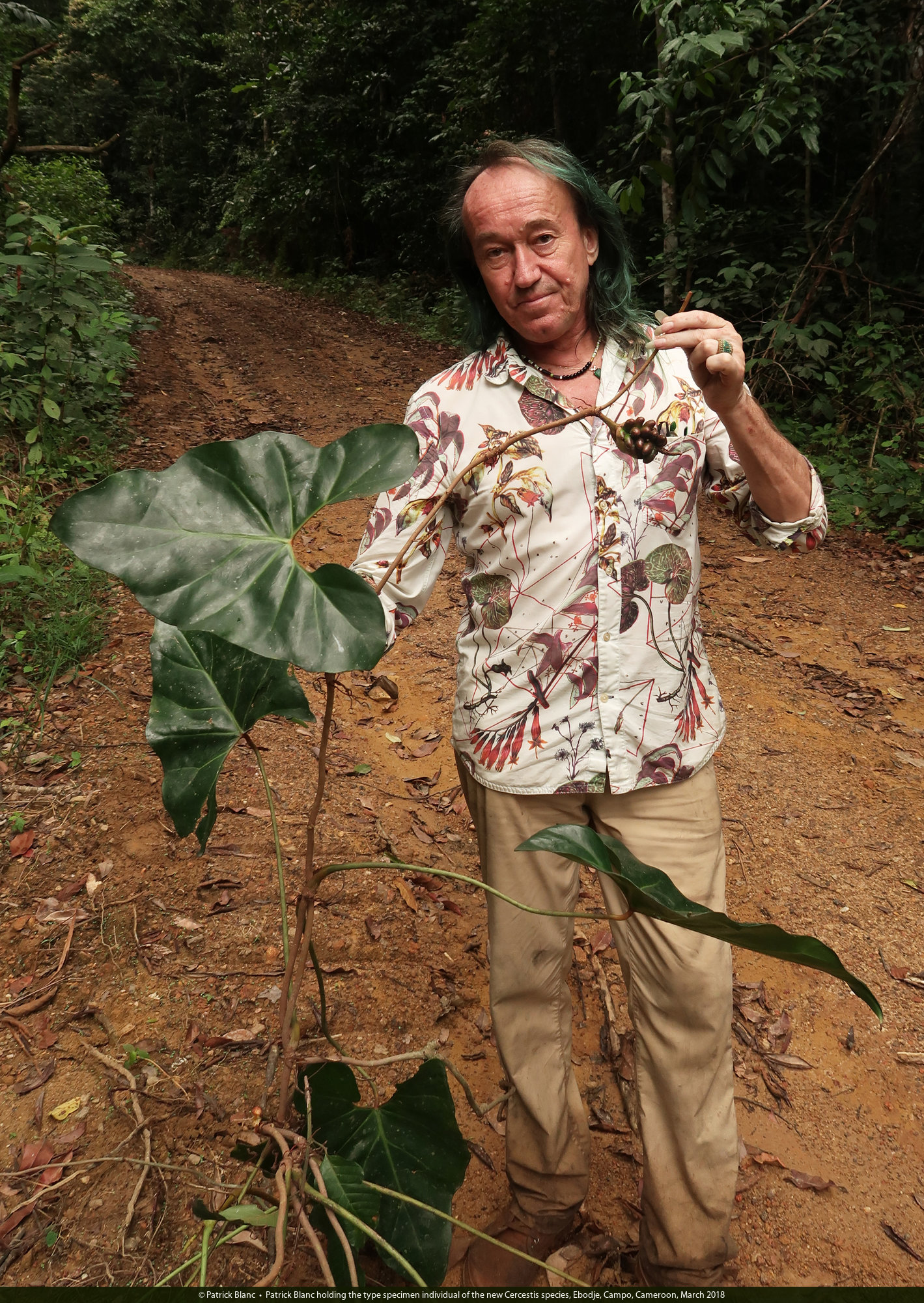 Patrick Blanc holding a specimen individual of the new Cercestis species, Ebodje, Campo, Cameroon, March 2018