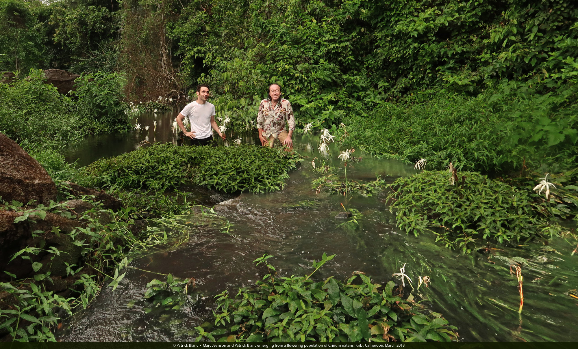 Marc Jeanson and Patrick Blanc emerging from a flowering population of Crinum natans, Kribi, Cameroon, March 2018