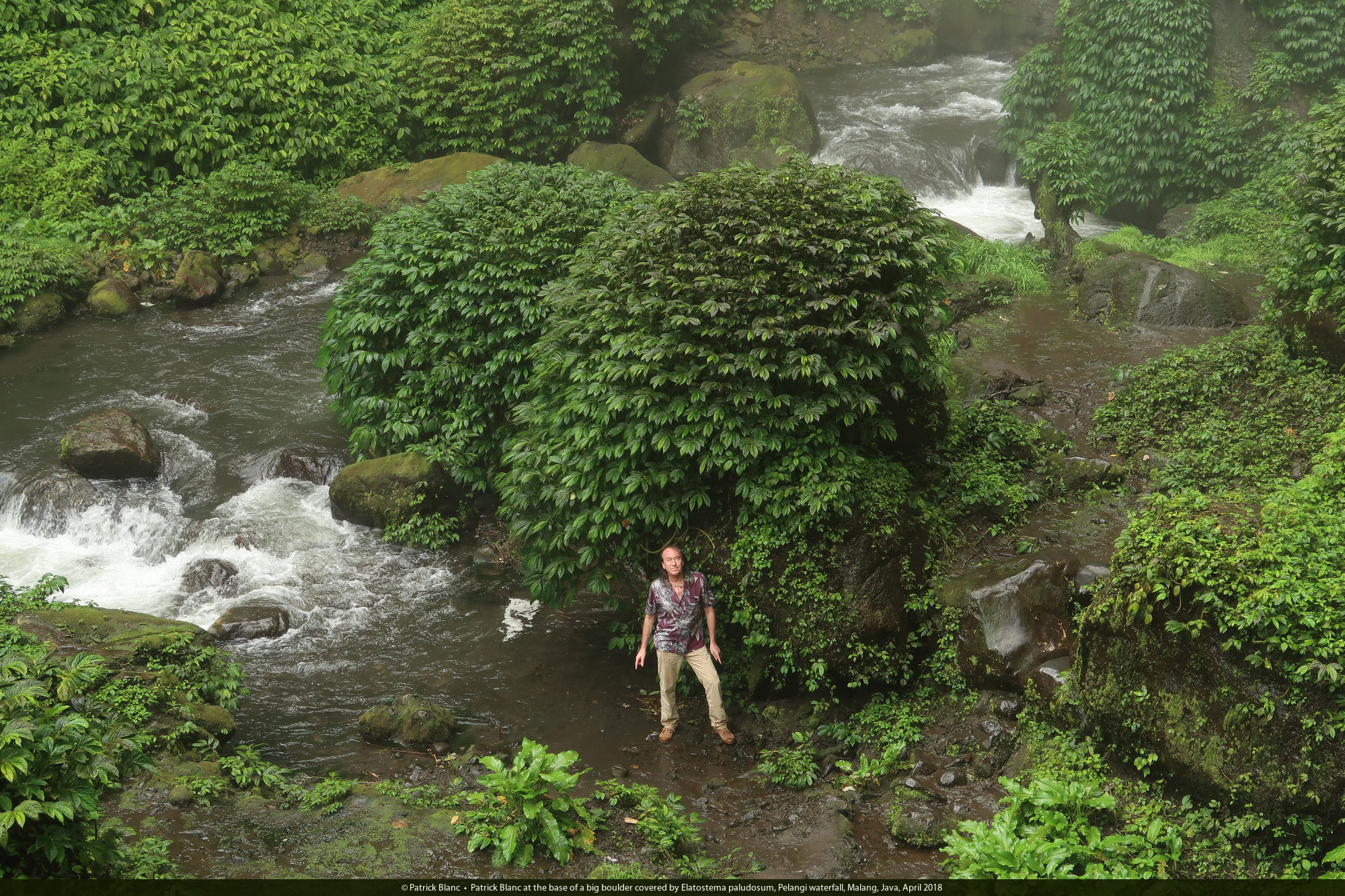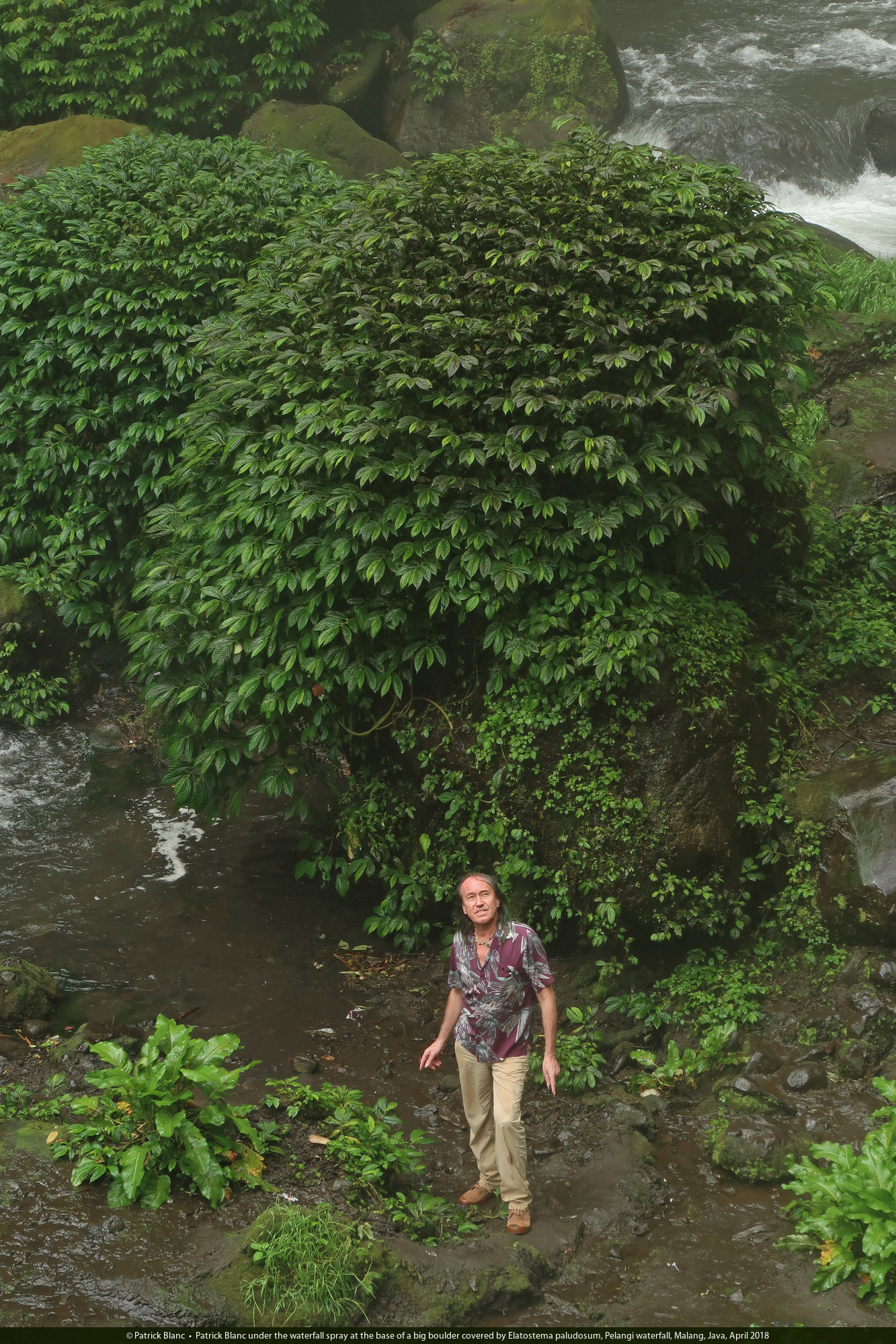 Patrick Blanc at the base of a big boulder covered by Elatostema macrophyllum, Pelangi waterfall, Malang, Java, April 2018