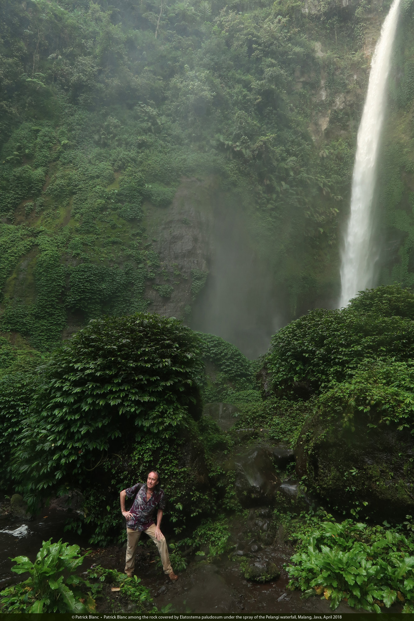 Patrick Blanc in front of the Jidor waterfall, Malang, Java, April 2018