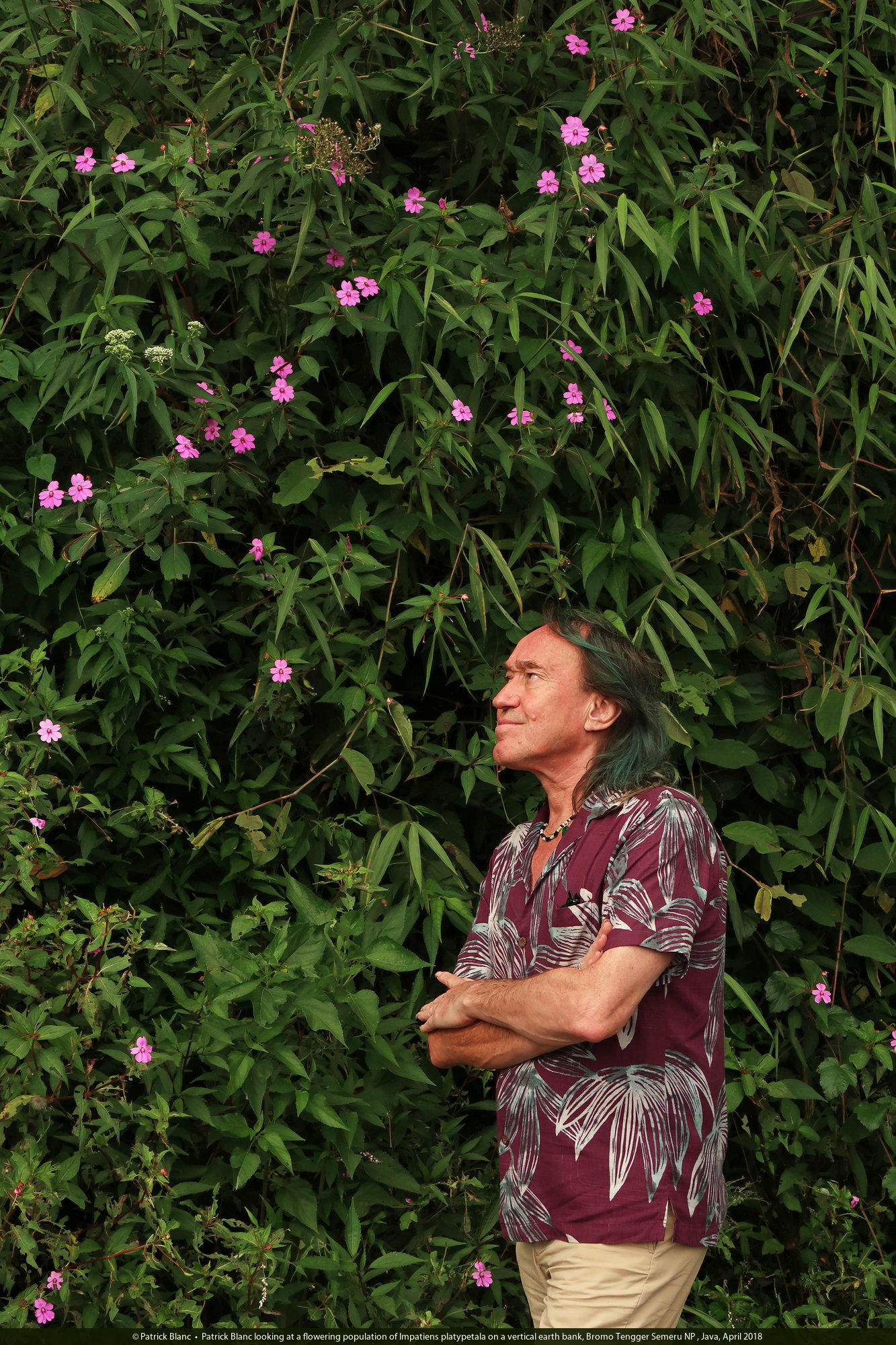 Patrick Blanc looking at a flowering population of Impatiens platypetala on a vertical earth bank, Bromo Tengger Semeru NP , Java, April 2018