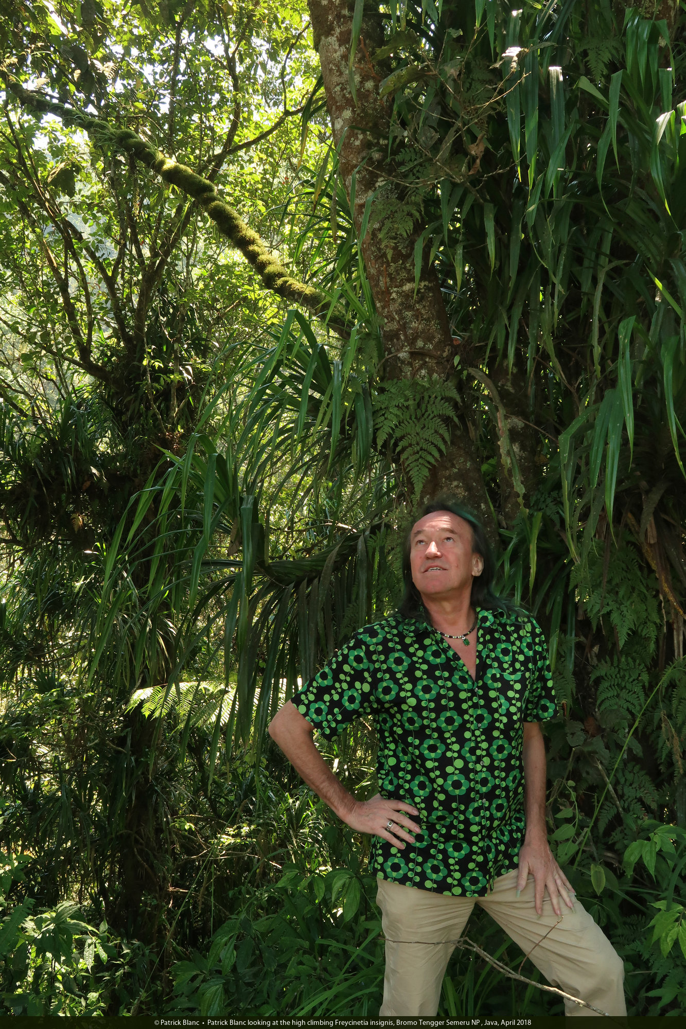 Patrick Blanc looking at the high climbing Freycinetia insignis, Bromo Tengger Semeru NP , Java, April 2018