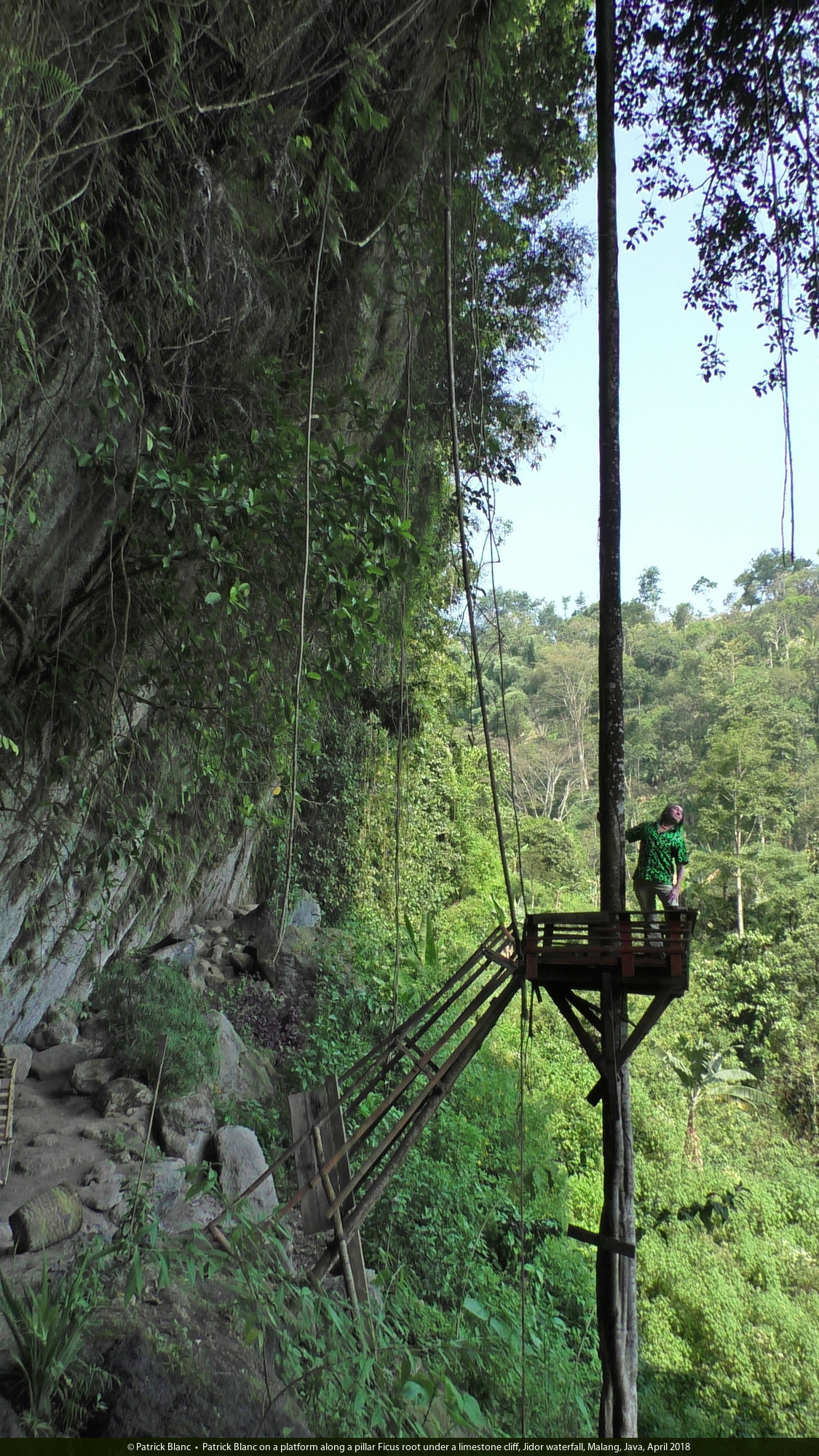 Patrick Blanc on a platform along a pillar Ficus root under a limestone cliff, Jidor waterfall, Malang, Java, April 2018