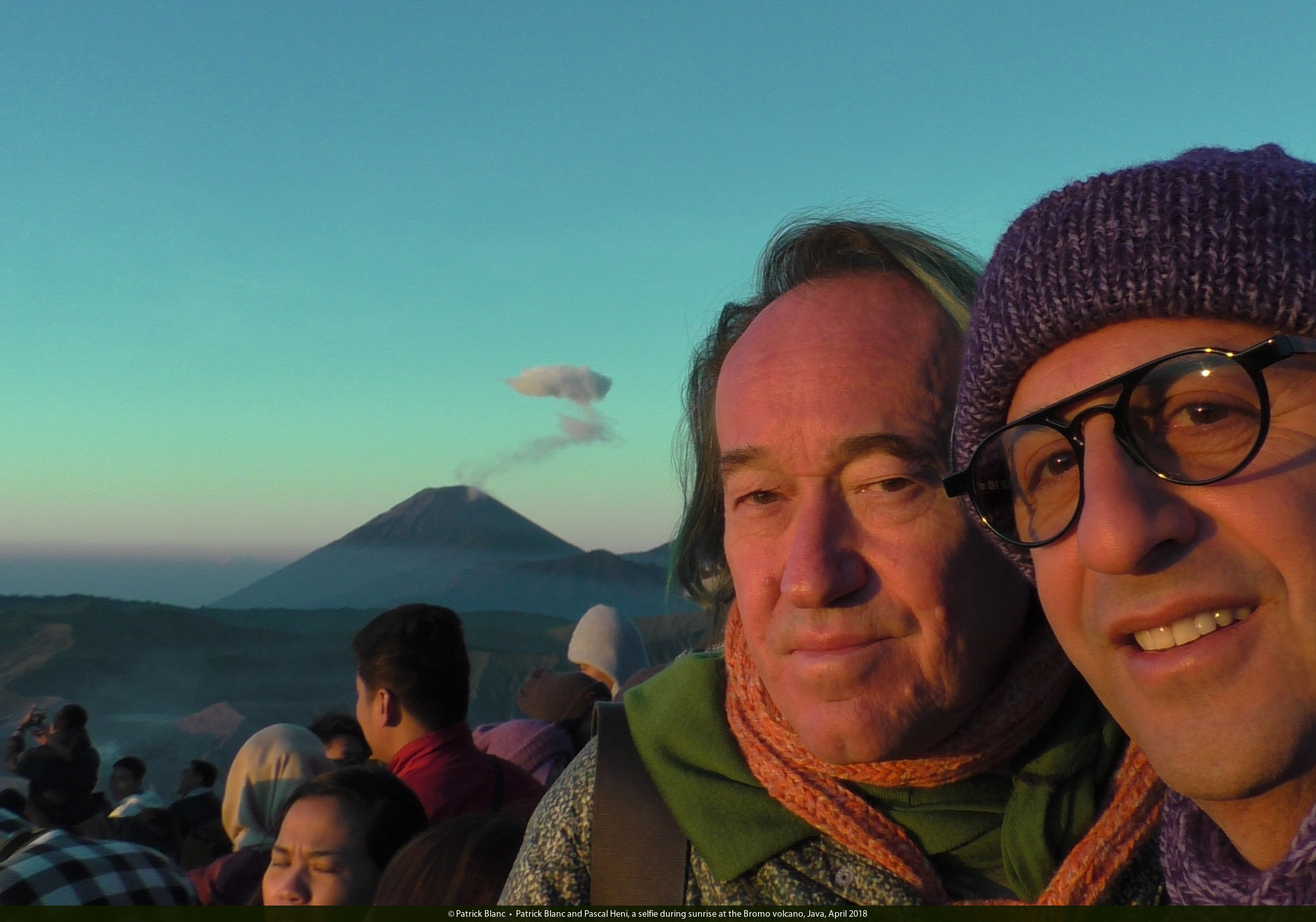 Patrick Blanc and Pascal Heni, a selfie during sunrise at the Bromo volcano, Java, April 2018