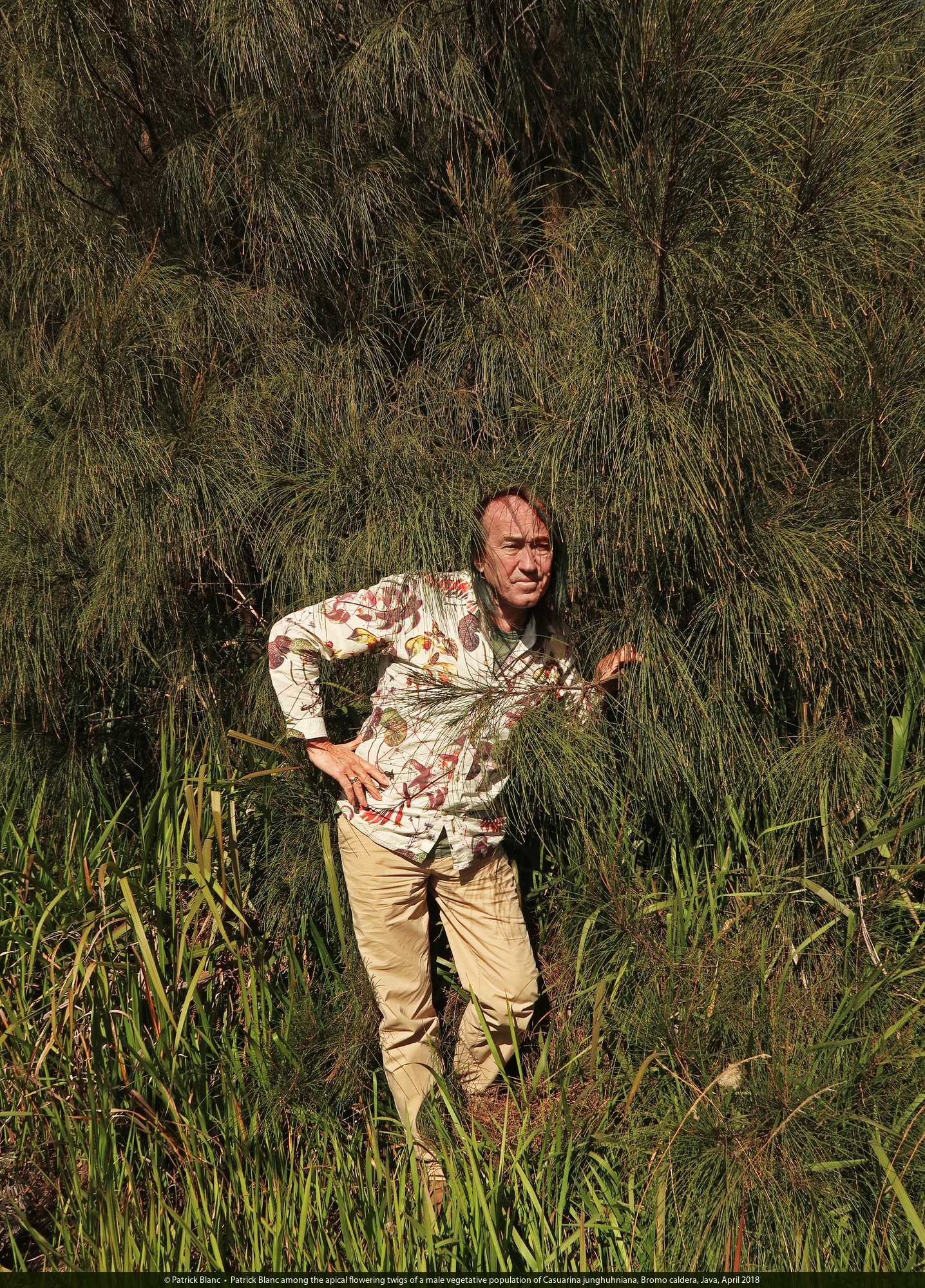 Patrick Blanc in front of a male vegetative population through root suckers of Casuarina junghuhniana, Bromo caldera, Java, April 2018