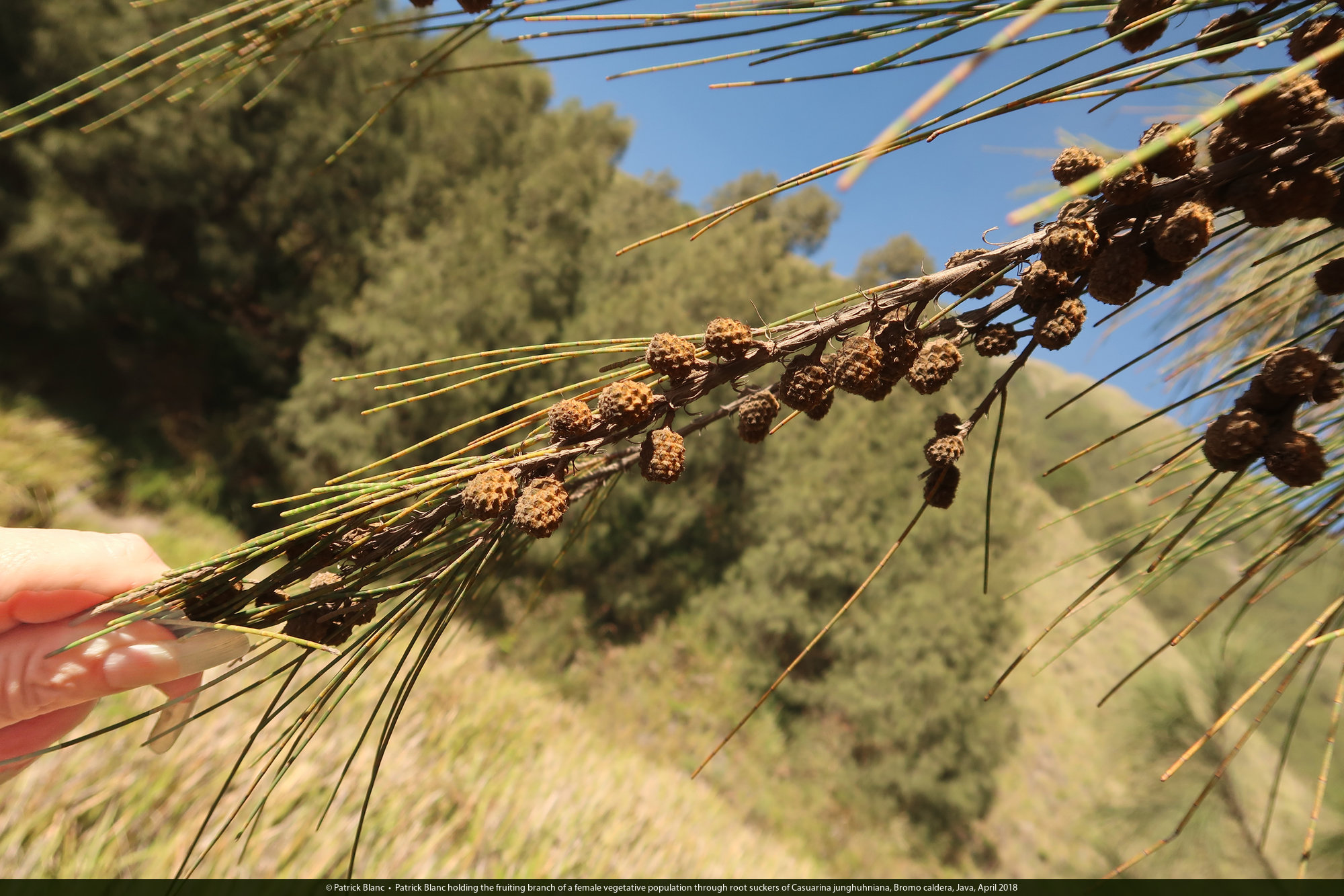 Patrick Blanc holding the fruiting branch of a female vegetative population through root suckers of Casuarina junghuhniana, Bromo caldera, Java, April 2018