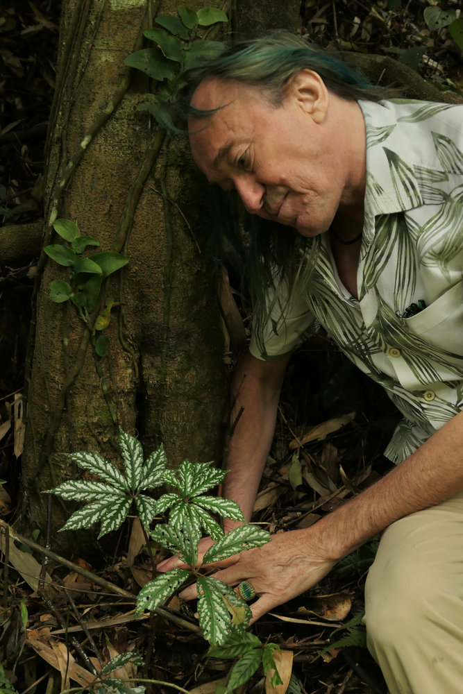 Patrick Blanc observing a population of Molineria sp. in a preserved swamp forest, Kandawgyi Botanical Garden Pyin U Lwin, Myanmar, Dec. 2017