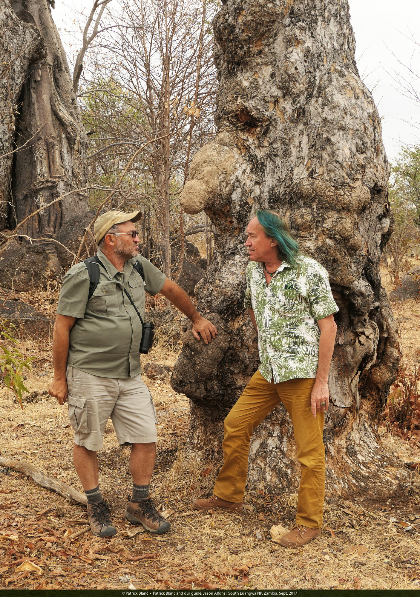 Patrick Blanc and a baobab, Adansonia digitata whose bark and sapwood have been repeatidly peeled and eaten by elephants, South Luangwa NP, Zambia, Sept. 2017