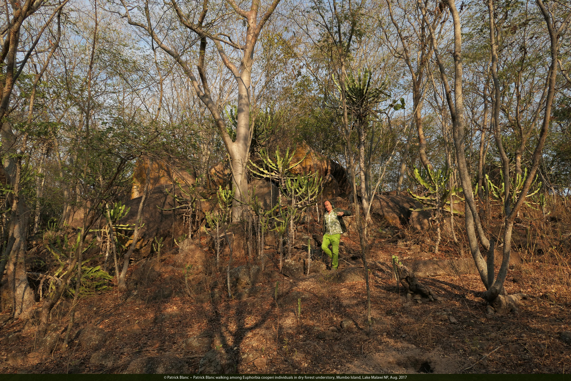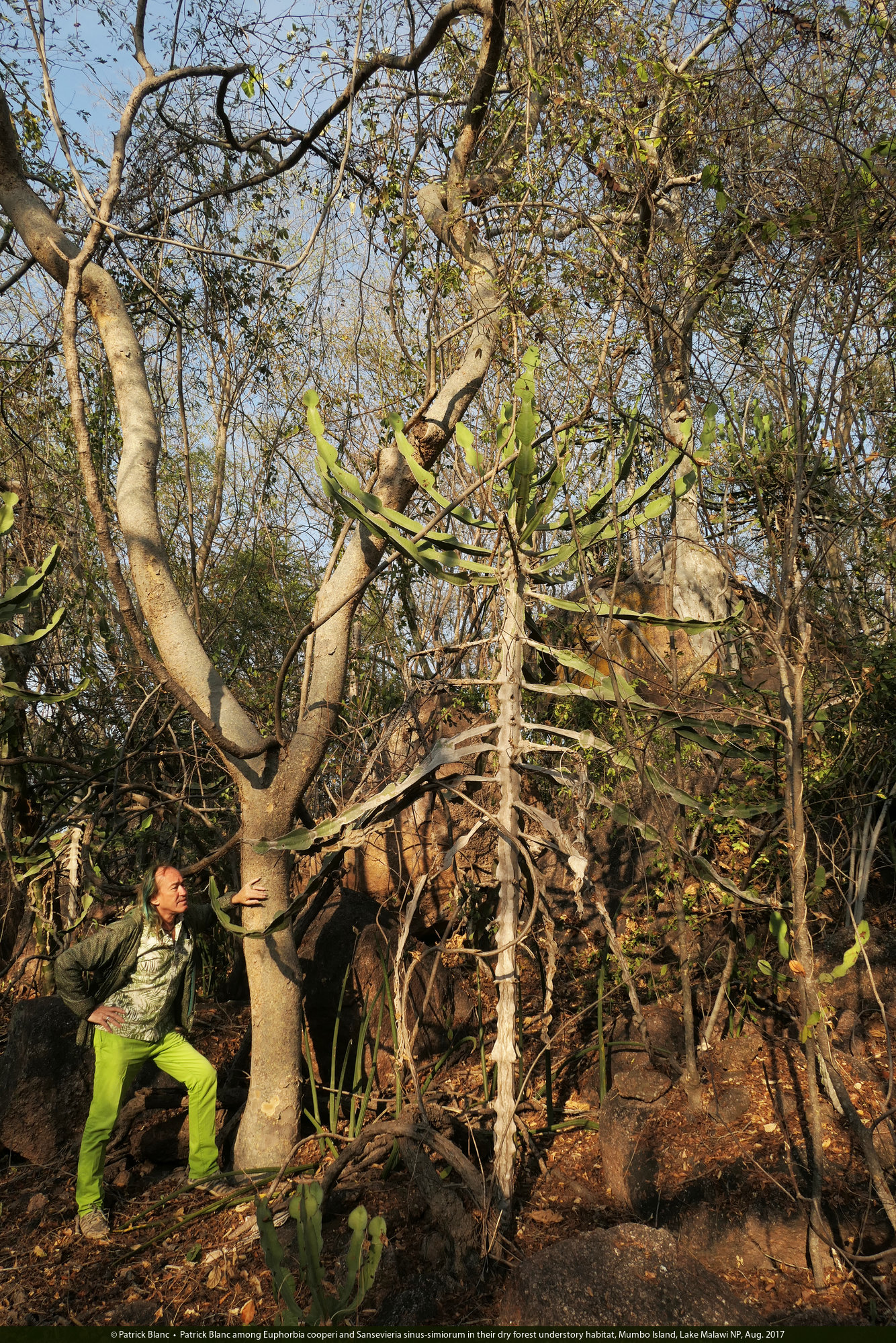 Patrick Blanc among Euphorbia cooperi and Sansevieria sinus-simiorum in their dry forest understory habitat, Mumbo Island, Lake Malawi NP, Aug. 2017