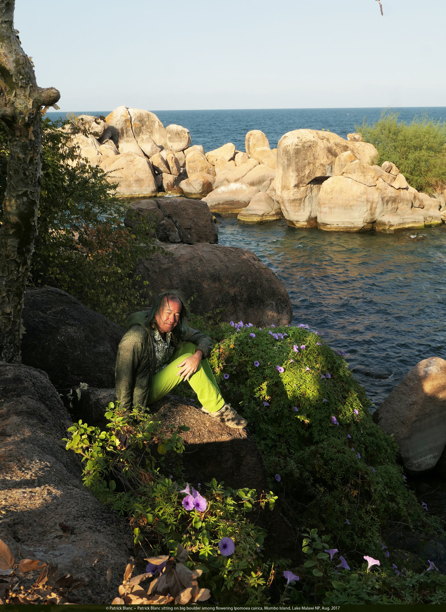 Patrick Blanc on big boulder among flowering Ipomoea cairica, Mumbo Island, Lake Malawi NP, Aug. 2017