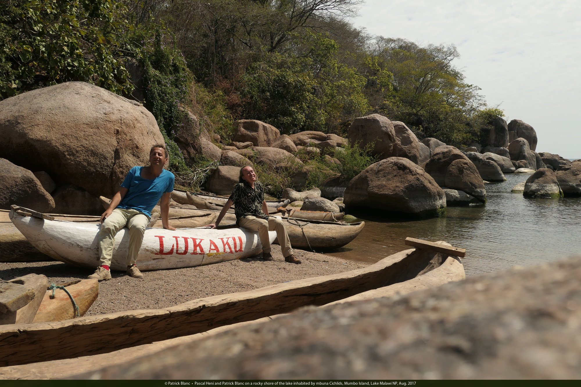 Pascal Heni and Patrick Blanc on a rocky shore of the lake inhabited by mbuna Cichlids, Mumbo Island, Lake Malawi NP, Aug. 2017