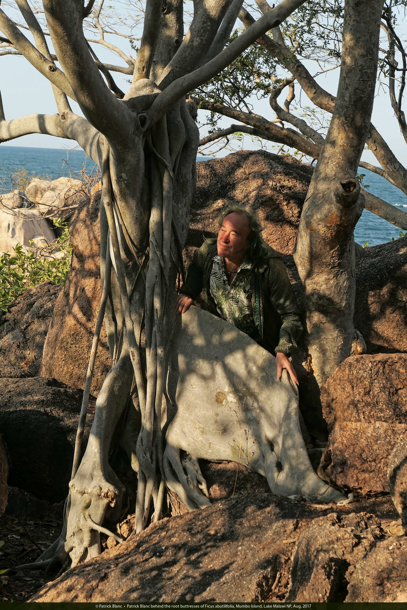 Patrick Blanc behind the root buttresses of Ficus abutilifolia, Mumbo Island, Lake Malawi NP, Aug. 2017