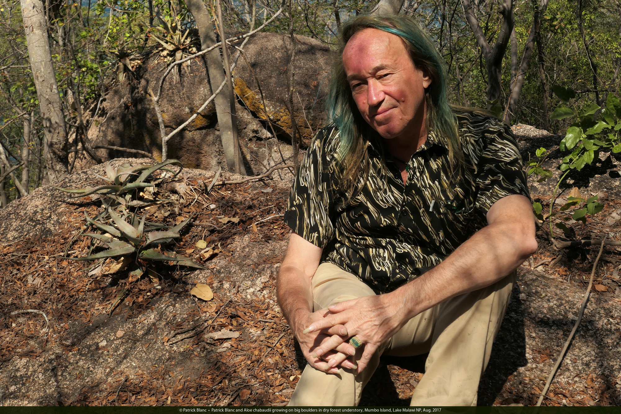 Patrick Blanc and Aloe chabaudii growing on big boulders in dry forest understory, Mumbo Island, Lake Malawi NP, Aug. 2017