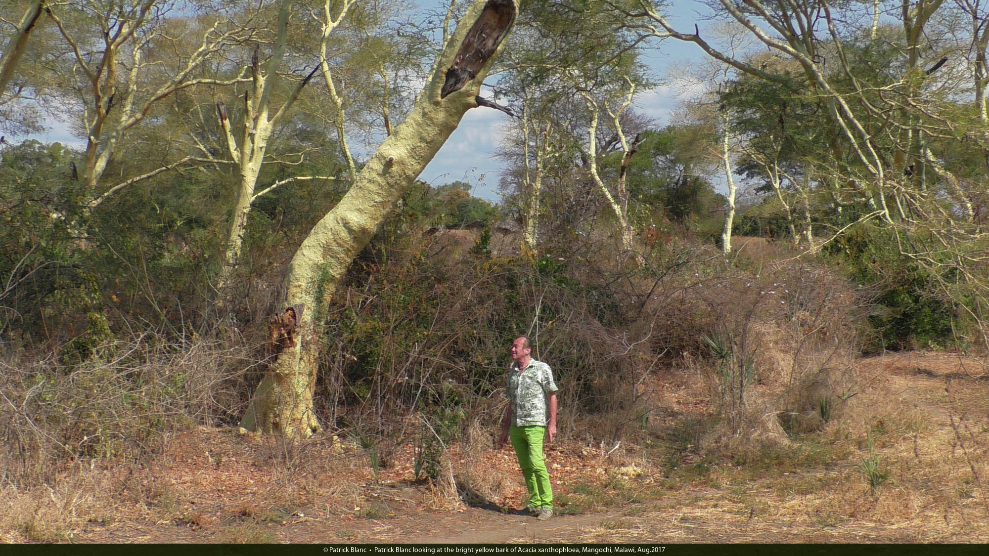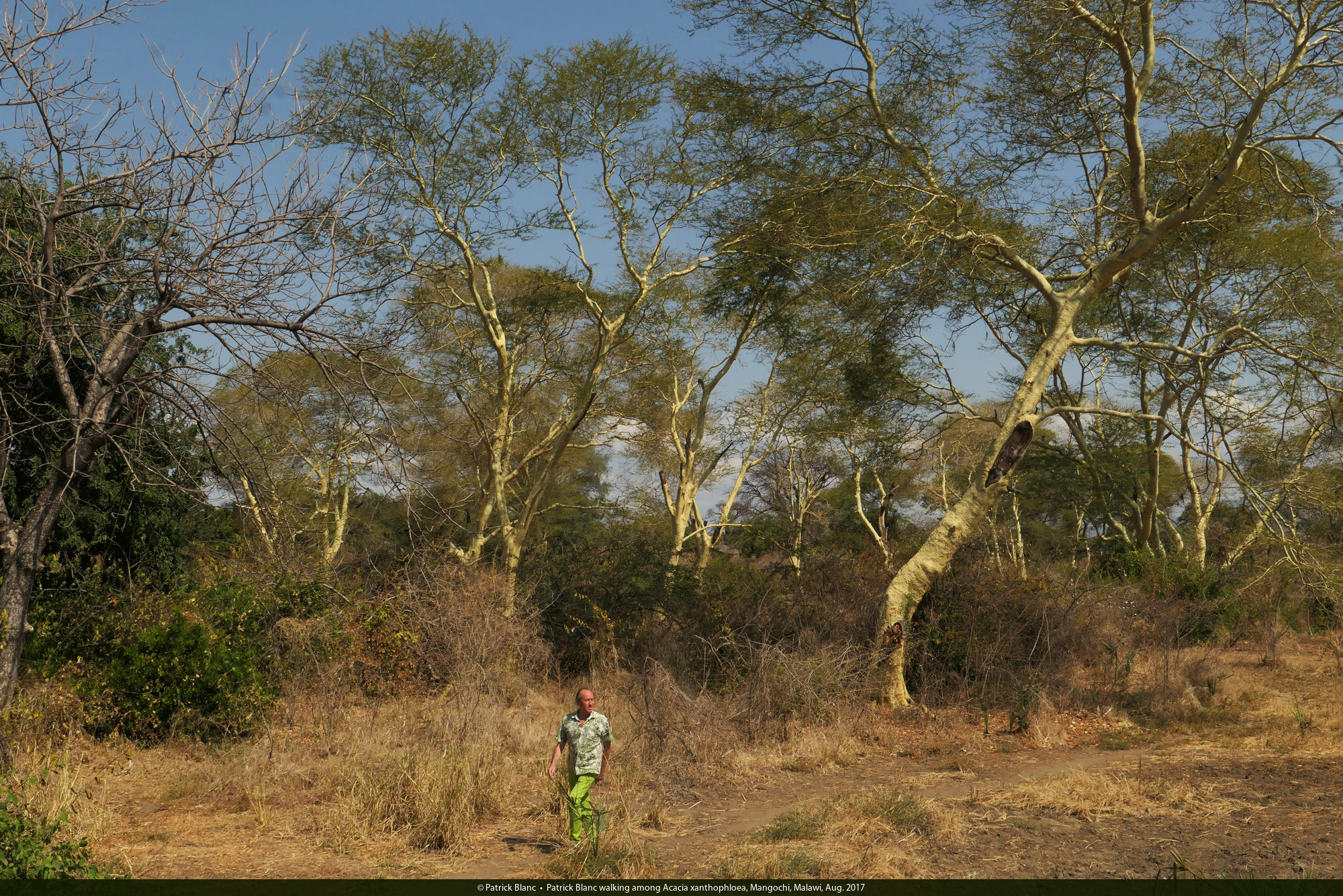 Patrick Blanc walking among Acacia xanthophloea, Mangochi, Malawi, Aug. 2017