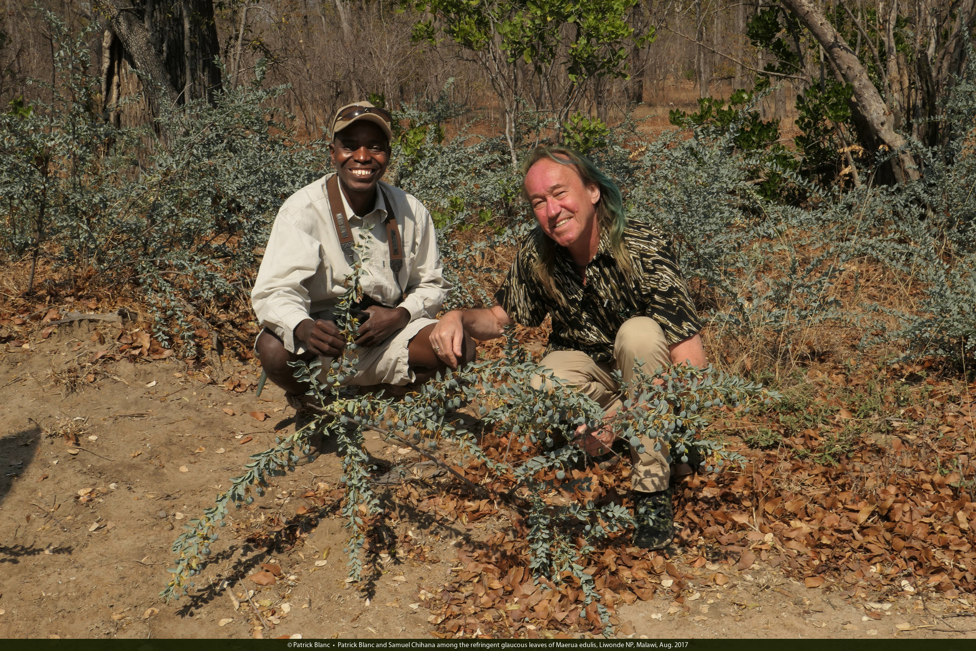Patrick Blanc and Samuel Chihana among the refringent glaucous leaves of Maerua edulis, Liwonde NP, Malawi, Aug. 2017