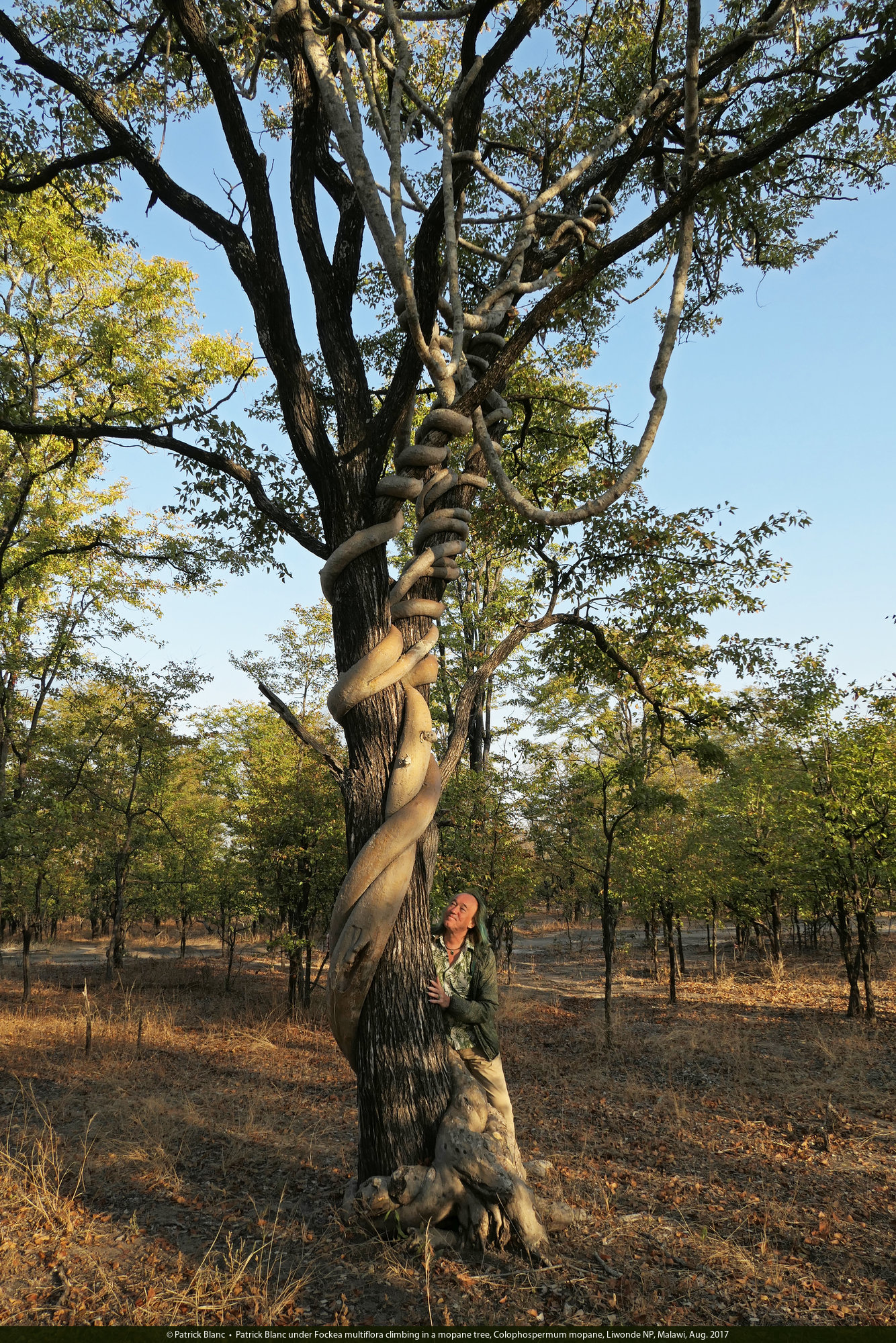 Patrick Blanc under Fockea multiflora climbing in a mopane tree, Colophospermum mopane, Liwonde NP, Malawi, Aug. 2017