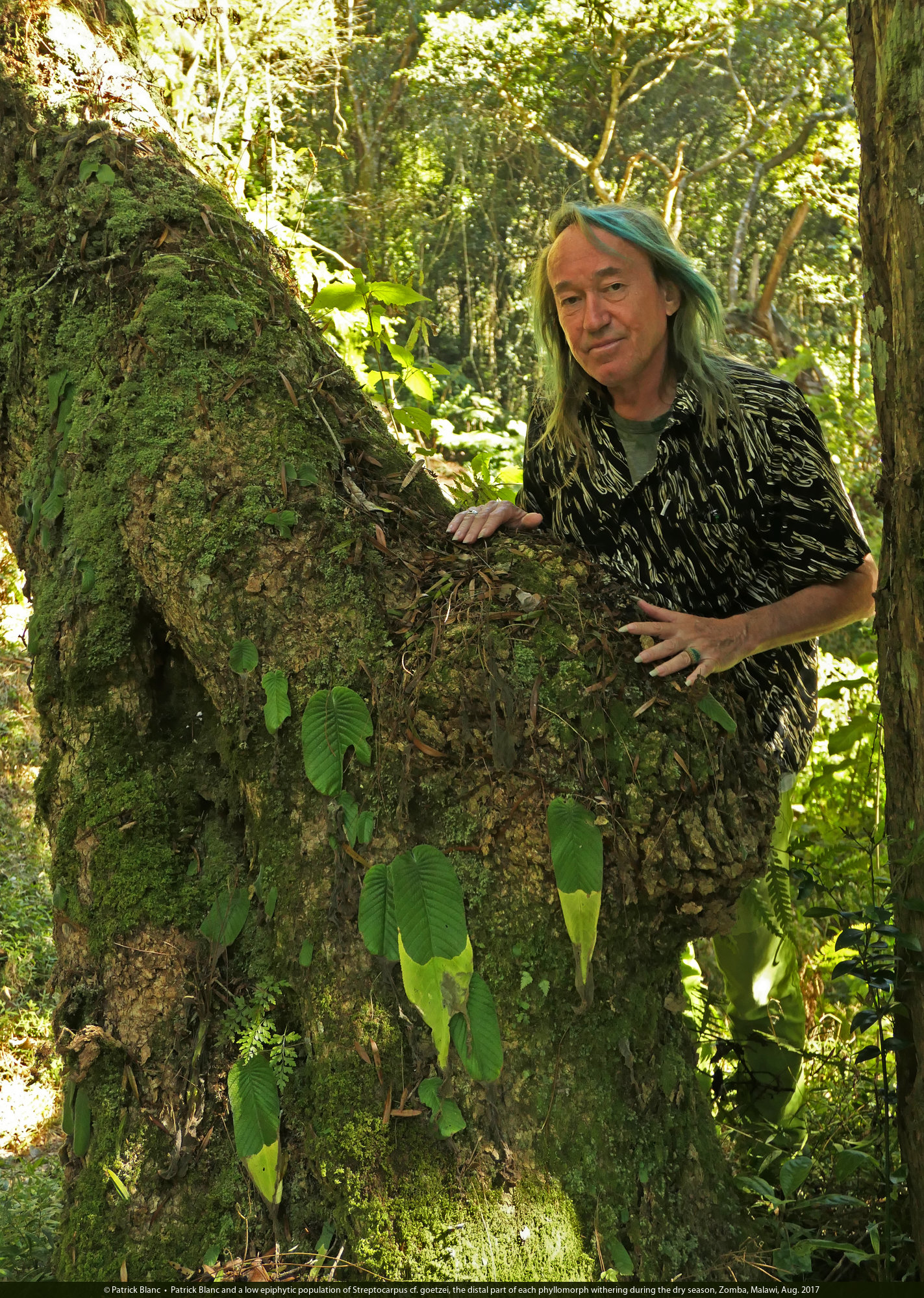 Patrick Blanc and a low epiphytic population of Streptocarpus cf. goetzei, the distal part of each phyllomorph withering during the dry season, Zomba, Malawi, Aug. 2017