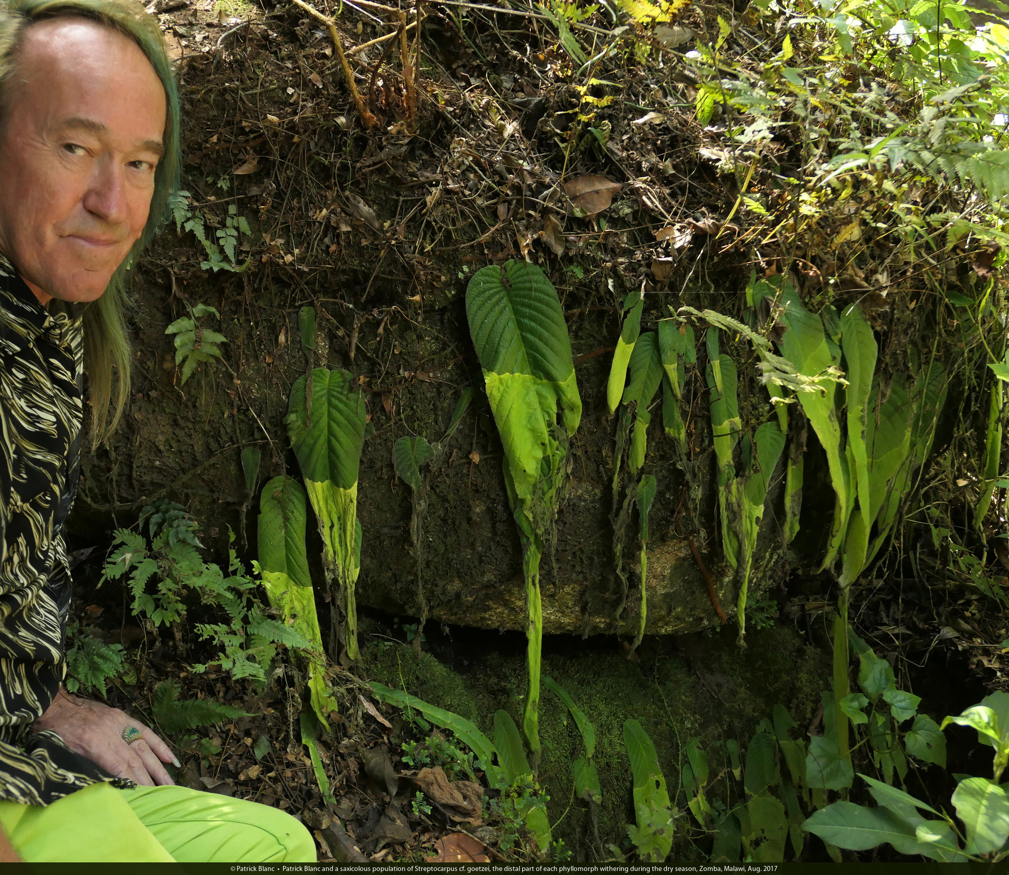 Patrick Blanc and a saxicolous population of Streptocarpus cf. goetzei, the distal part of each phyllomorph withering during the dry season, Zomba, Malawi, Aug. 2017