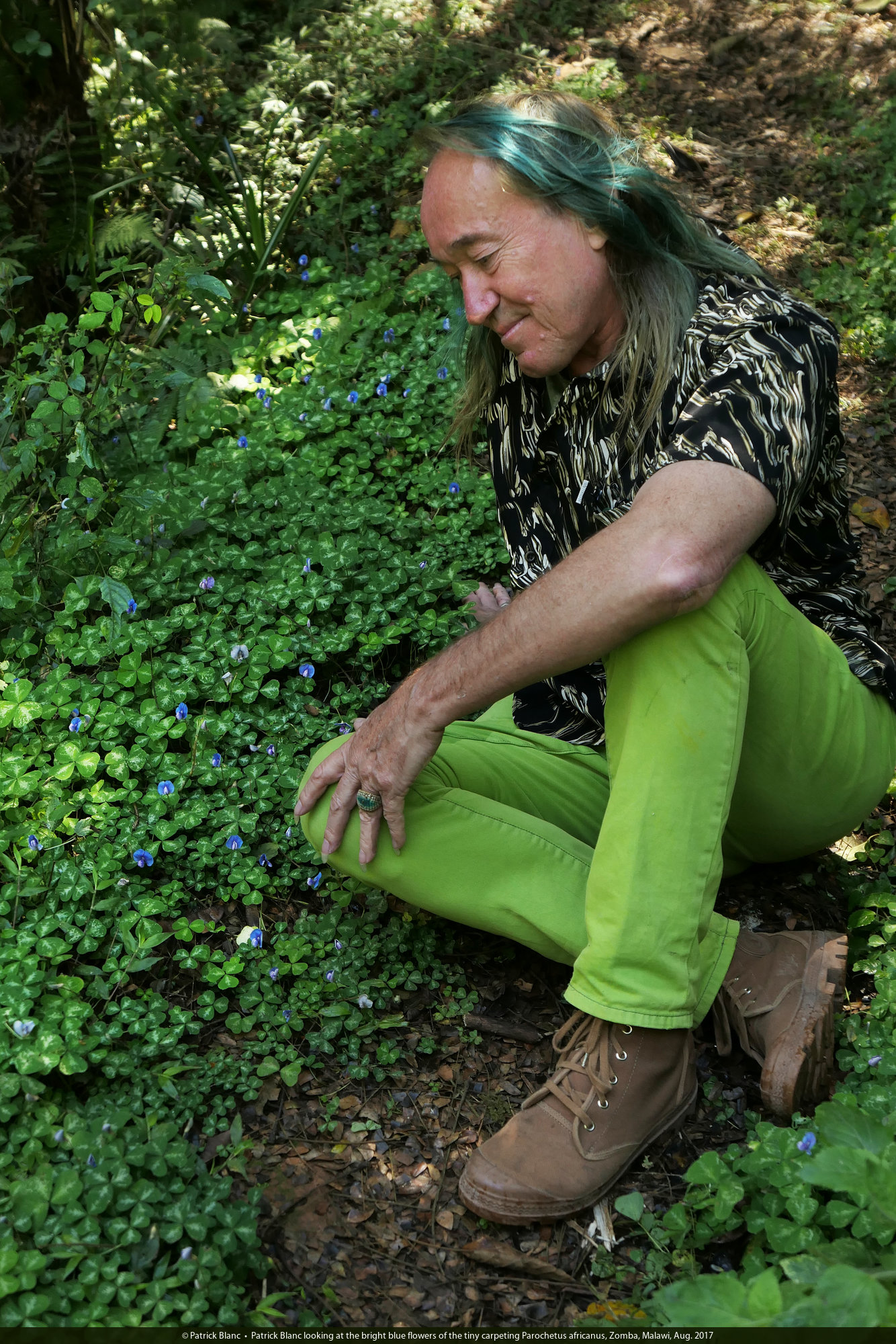 Patrick Blanc looking at the bright blue flowers of the tiny carpeting Parochetus africanus, Zomba, Malawi, Aug. 2017