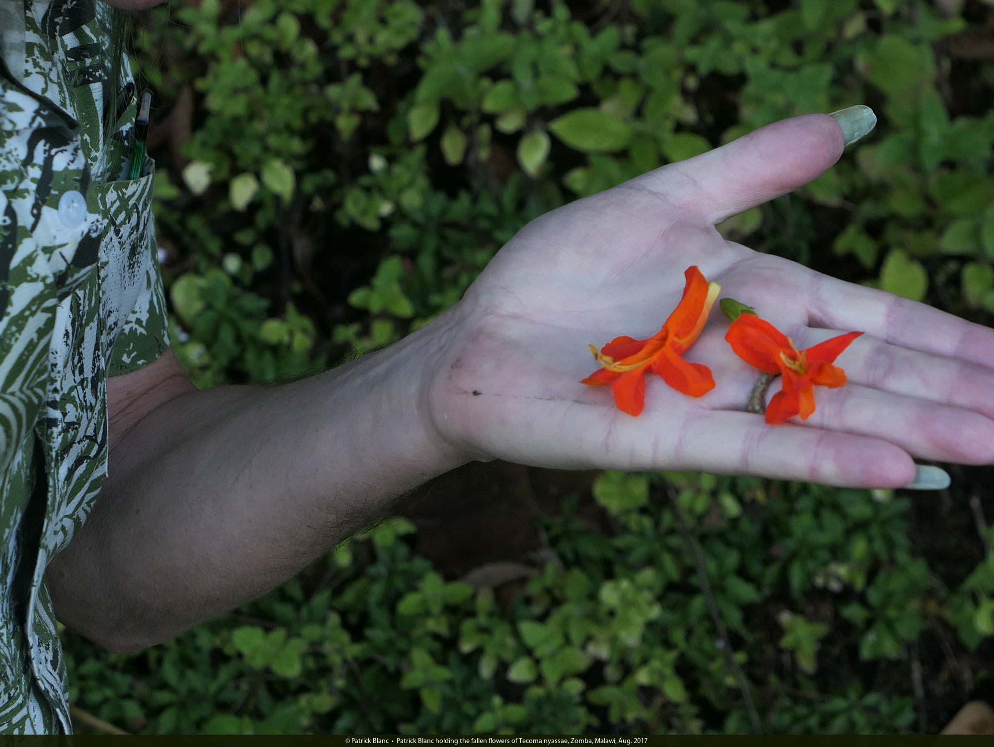 Patrick Blanc holding the fallen flowers of Tecoma nyassae, Zomba, Malawi, Aug. 2017