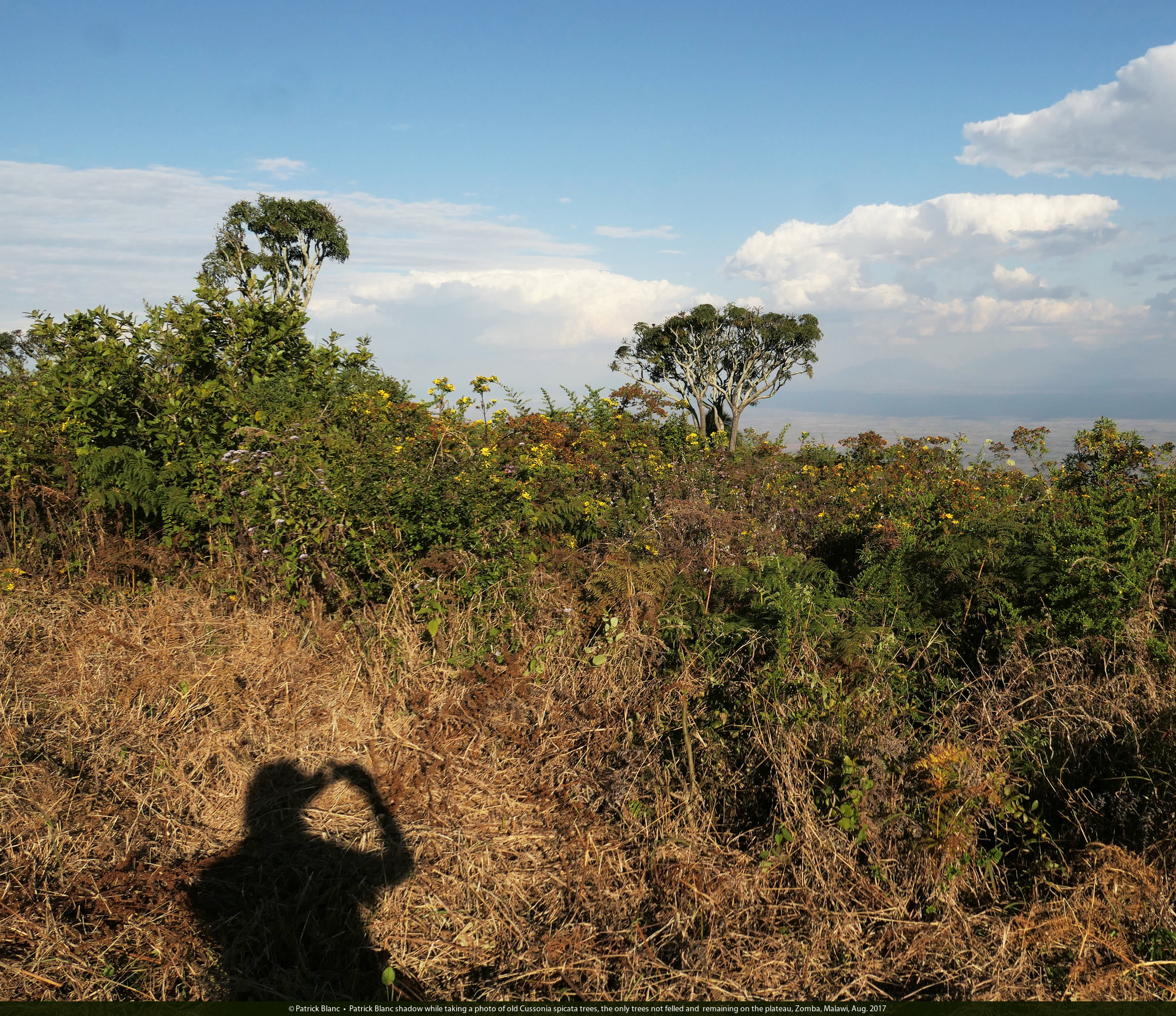 Patrick Blanc shadow while taking a photo of old Cussonia spicata trees, the only trees not felled and remaining on the plateau, Zomba, Malawi, Aug. 2017