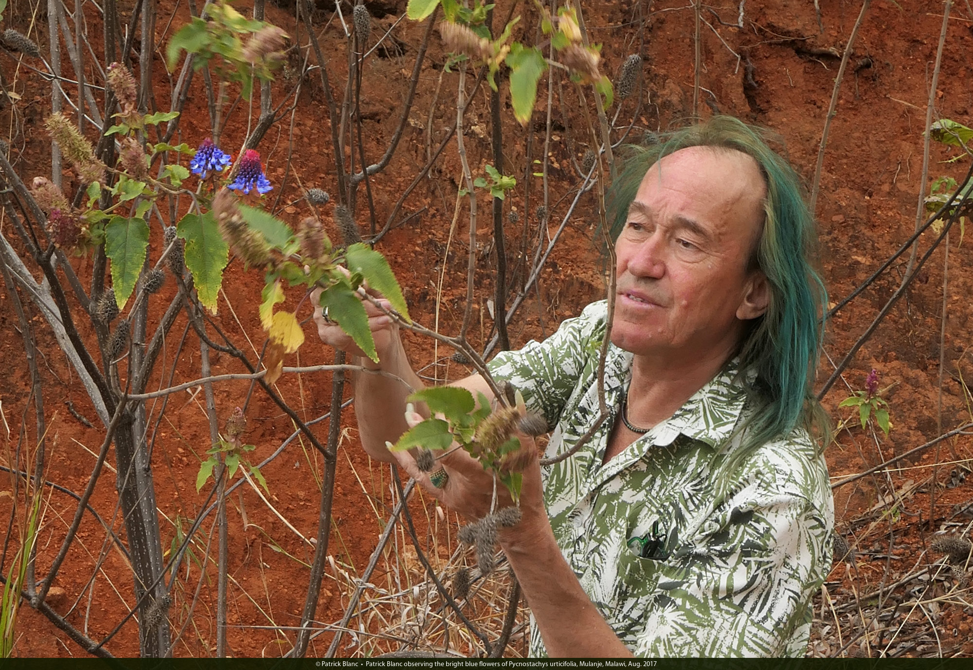 Patrick Blanc observing the bright blue flowers of Pycnostachys urticifolia, Mulanje, Malawi, Aug. 2017