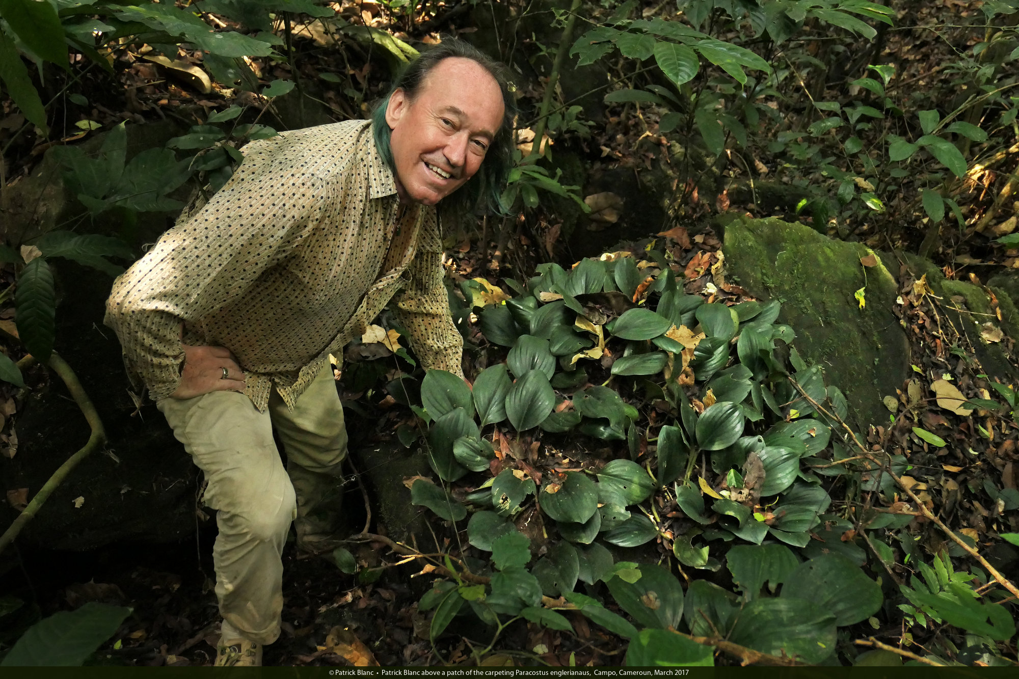 Patrick Blanc observing a patch of the carpeting Paracostus englerianus, Campo, Cameroun, March 2017