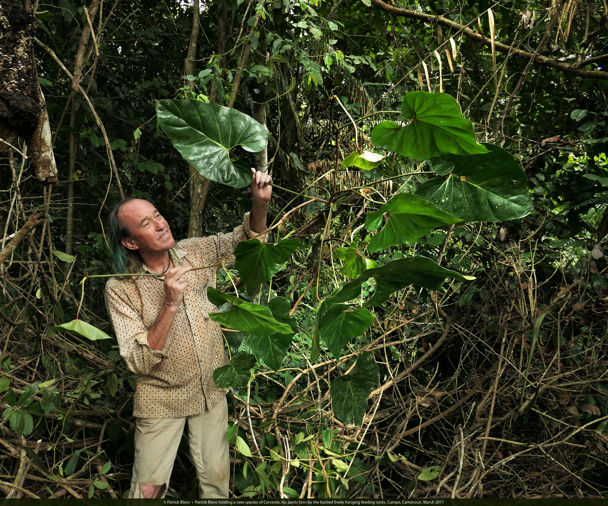Patrick Blanc holding a new species of Cercestis, his pants torn by the barbed freely hanging feeding roots, Campo, Cameroun, March 2017