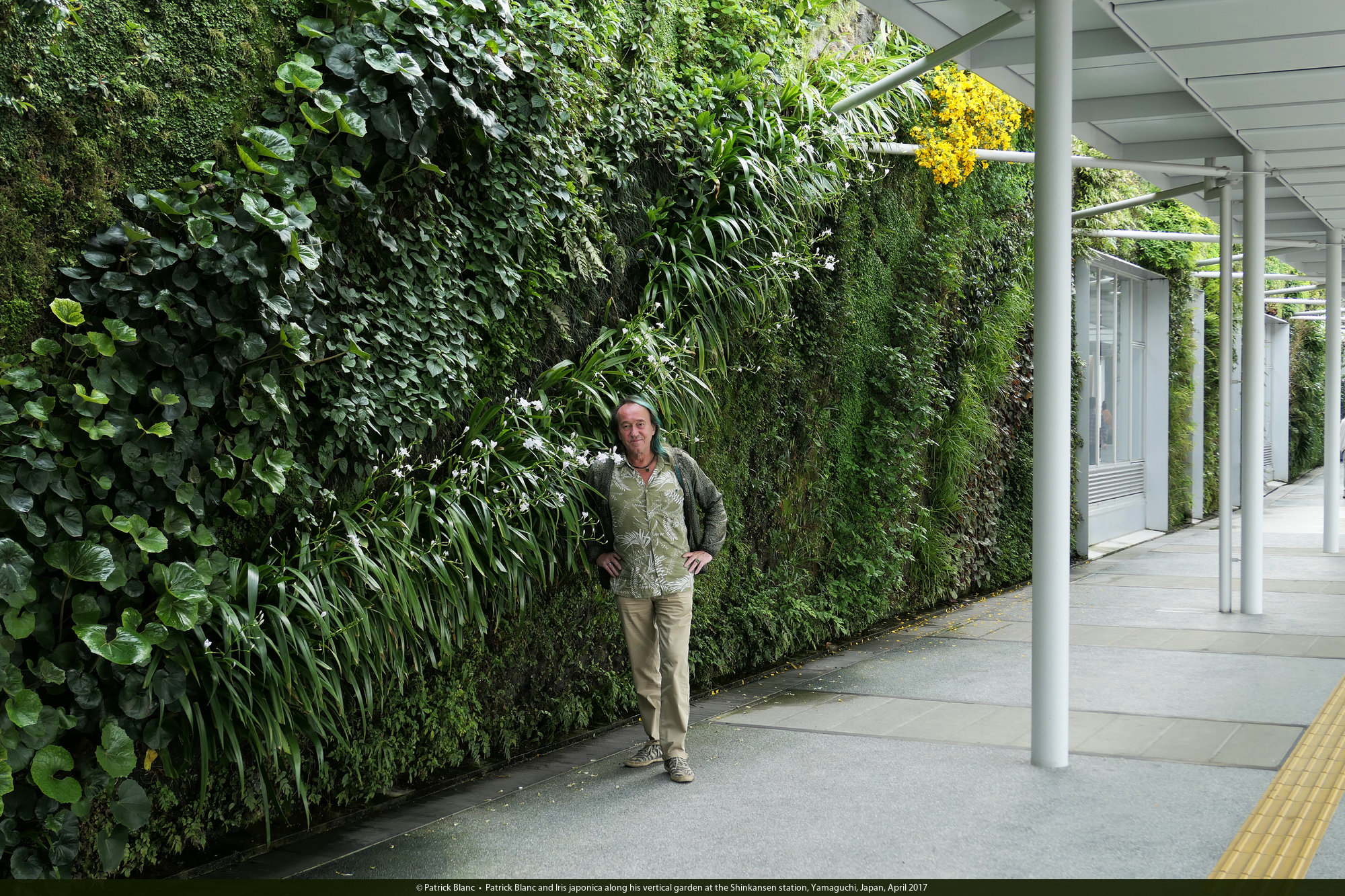 Patrick Blanc and Iris japonica along his vertical garden at the Shinkansen station, Yamaguchi, Japan, April 2017