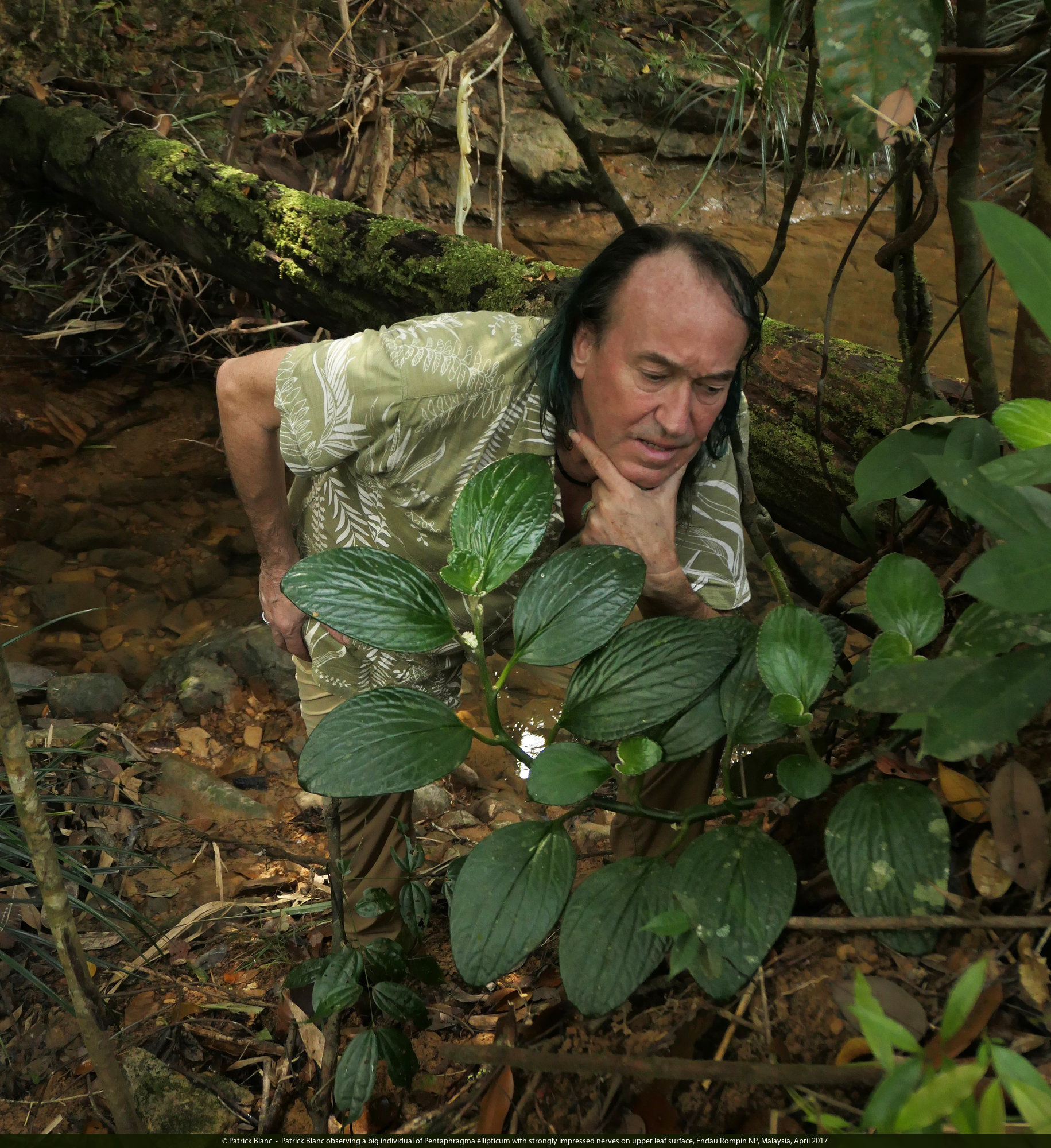 Patrick Blanc observing a big individual of Pentaphragma ellipticum with strongly impressed nerves on upper leaf surface, Endau Rompin NP, Malaysia, April 2017