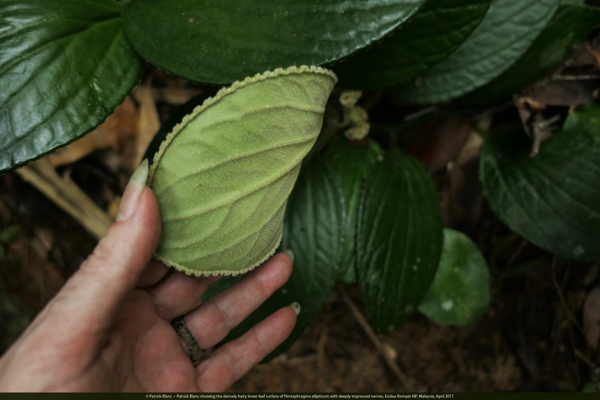 Patrick Blanc showing the densely hairy lower leaf surface of Pentaphragma ellipticum with deeply impressed nerves, Endau Rompin NP, Malaysia, April 2017