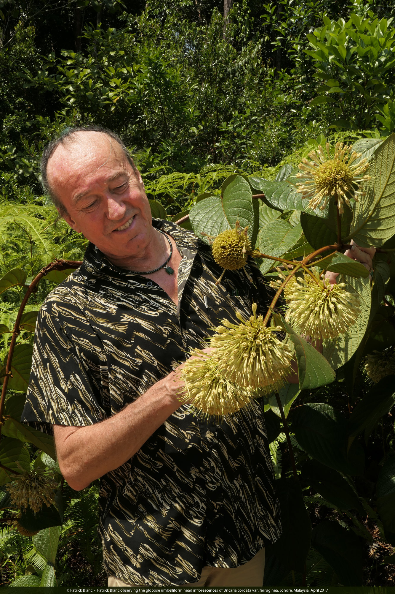 Patrick Blanc observing the globose umbelliform head inflorescences of Uncaria cordata var. ferruginea, Johore, Malaysia, April 2017