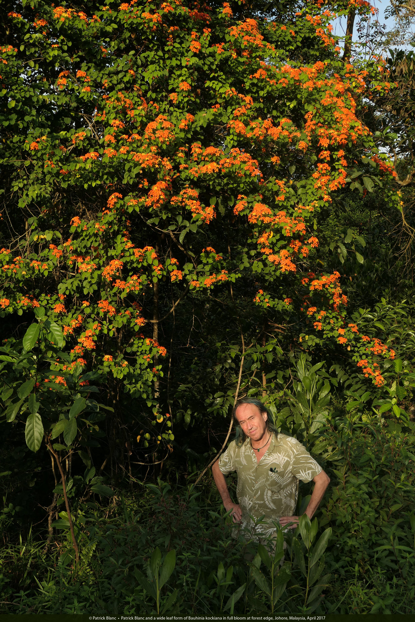 Patrick Blanc and a wide leaf form of Bauhinia kockiana in full bloom at forest edge, Johore, Malaysia, April 2017