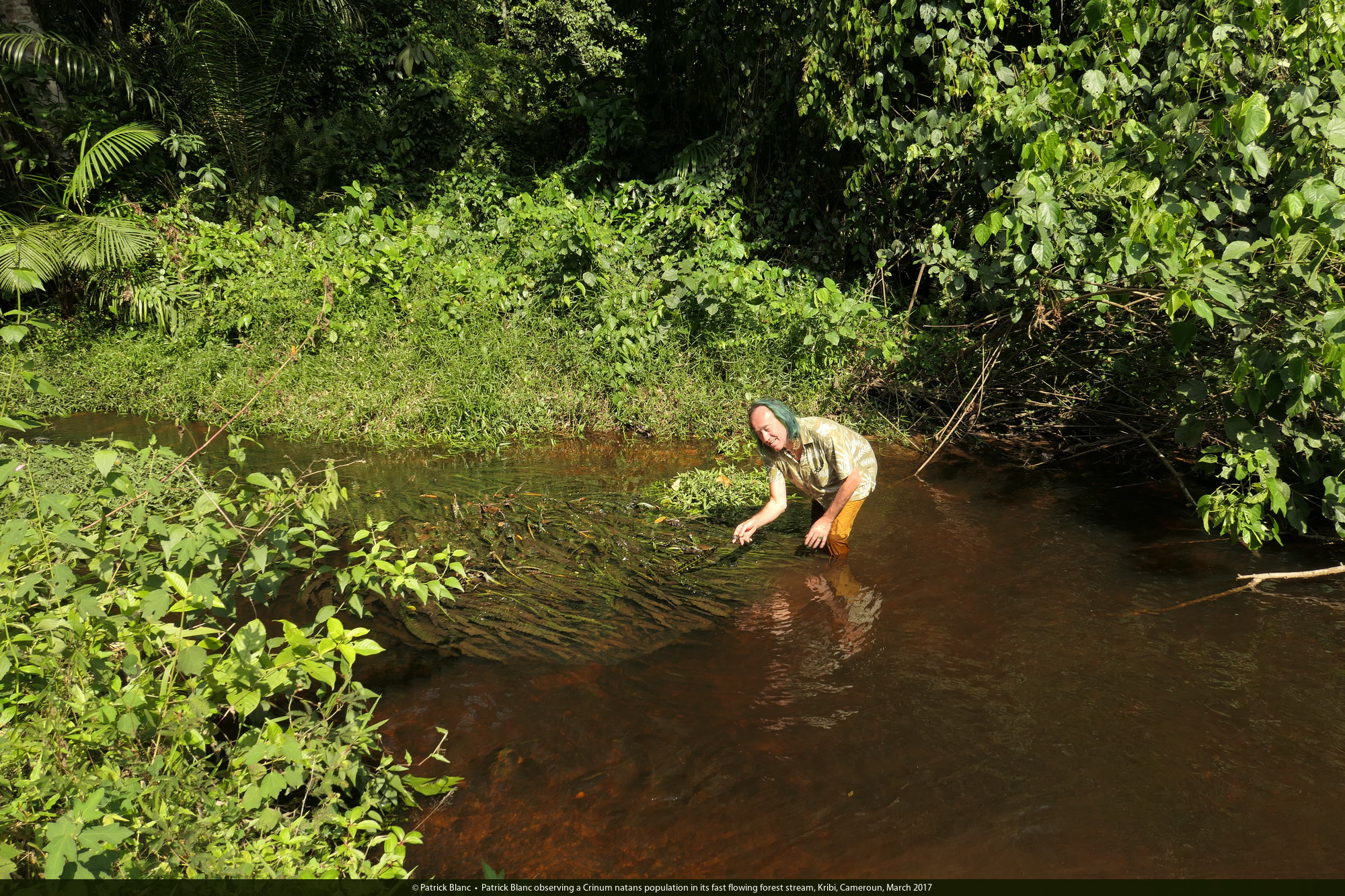 Patrick Blanc observing a Crinum natans population in its fast flowing forest stream, Kribi, Cameroun, March 2017