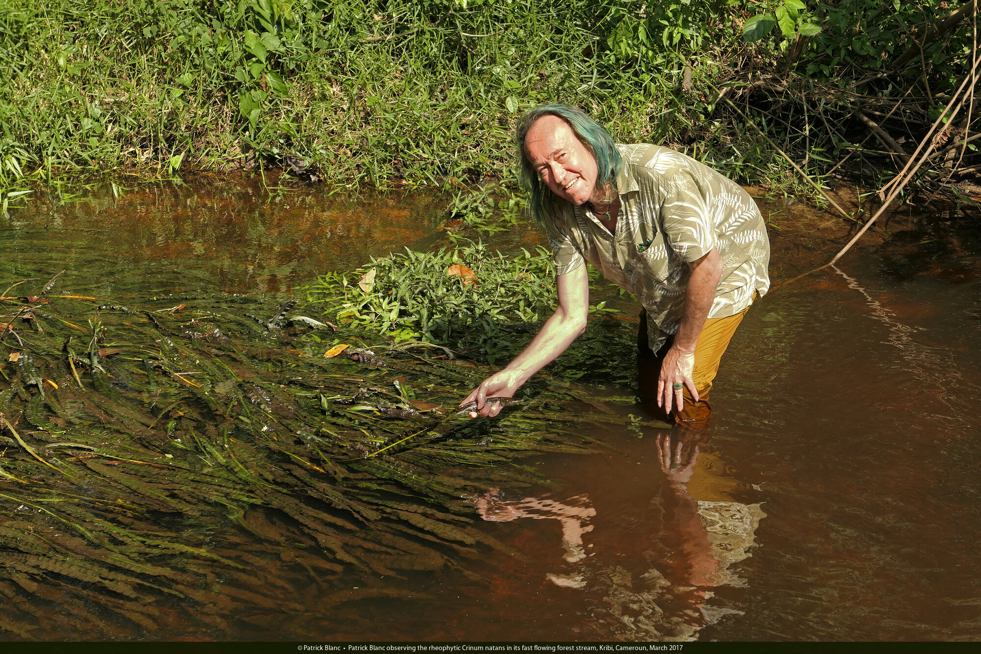 Patrick Blanc with the rheophytic Crinum natans in its fast flowing forest stream, Kribi, Cameroun, March 2017