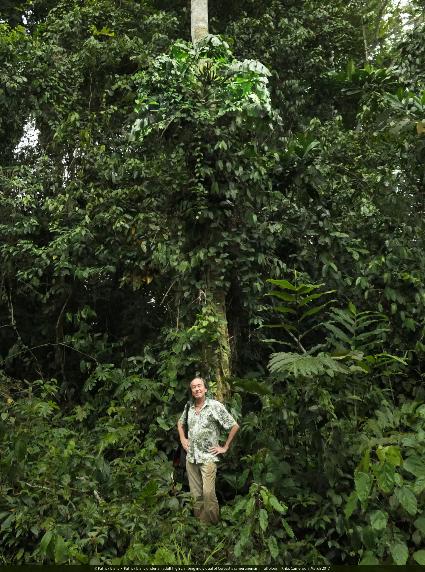Patrick Blanc under an adult high climbing individual of Cercestis camerunensis in full bloom, Kribi, Cameroun, March 2017