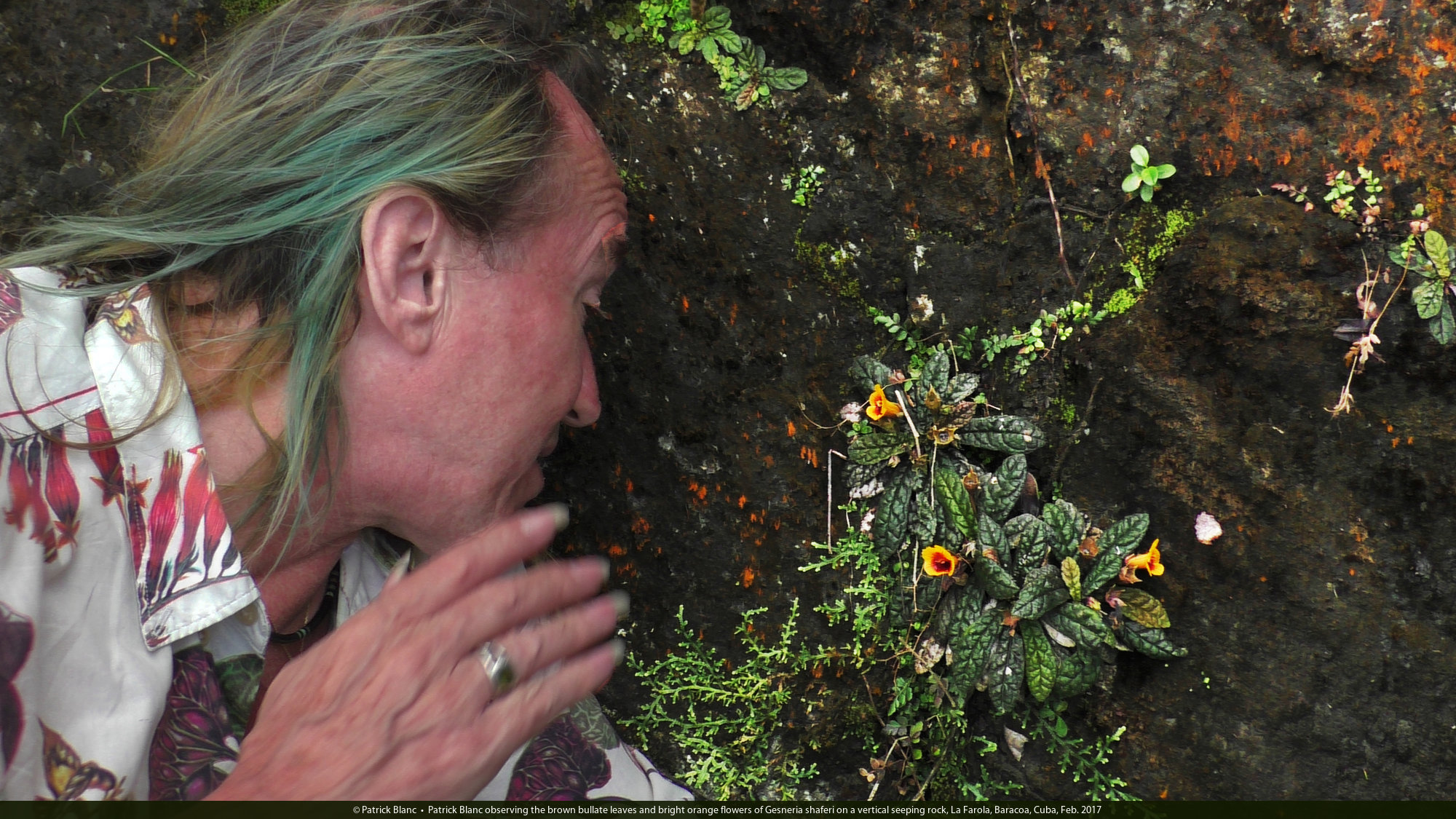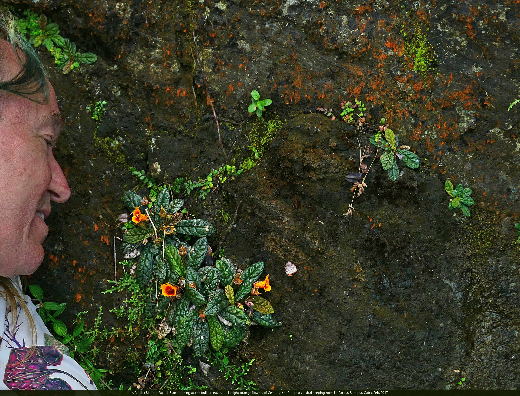Patrick Blanc observing the brown bullate leaves and bright orange flowers of Gesneria shaferi on a vertical seeping rock, La Farola, Baracoa, Cuba, Feb. 2017