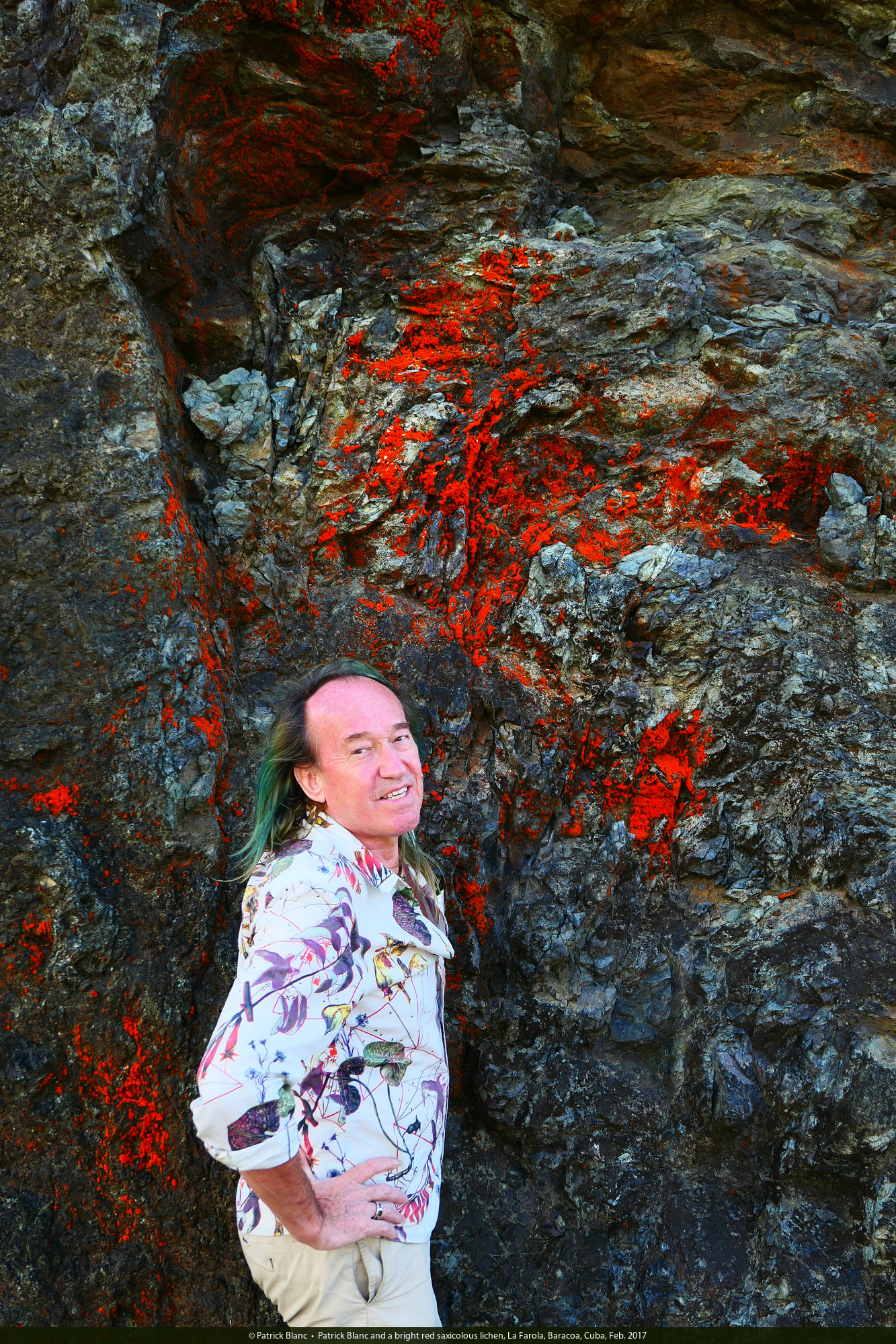 Patrick Blanc and a bright red saxicolous lichen, La Farola, Baracoa, Cuba, Feb. 2017