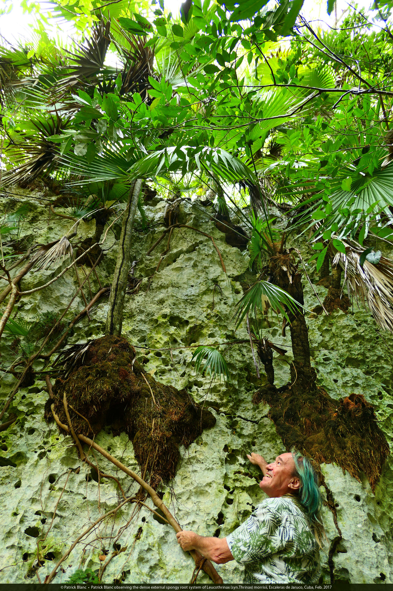 Patrick Blanc observing the huge and dense external spongy root system of Leucothrinax (syn.Thrinax) morrisii, Escaleras de Jaruco, Cuba, Feb. 2017