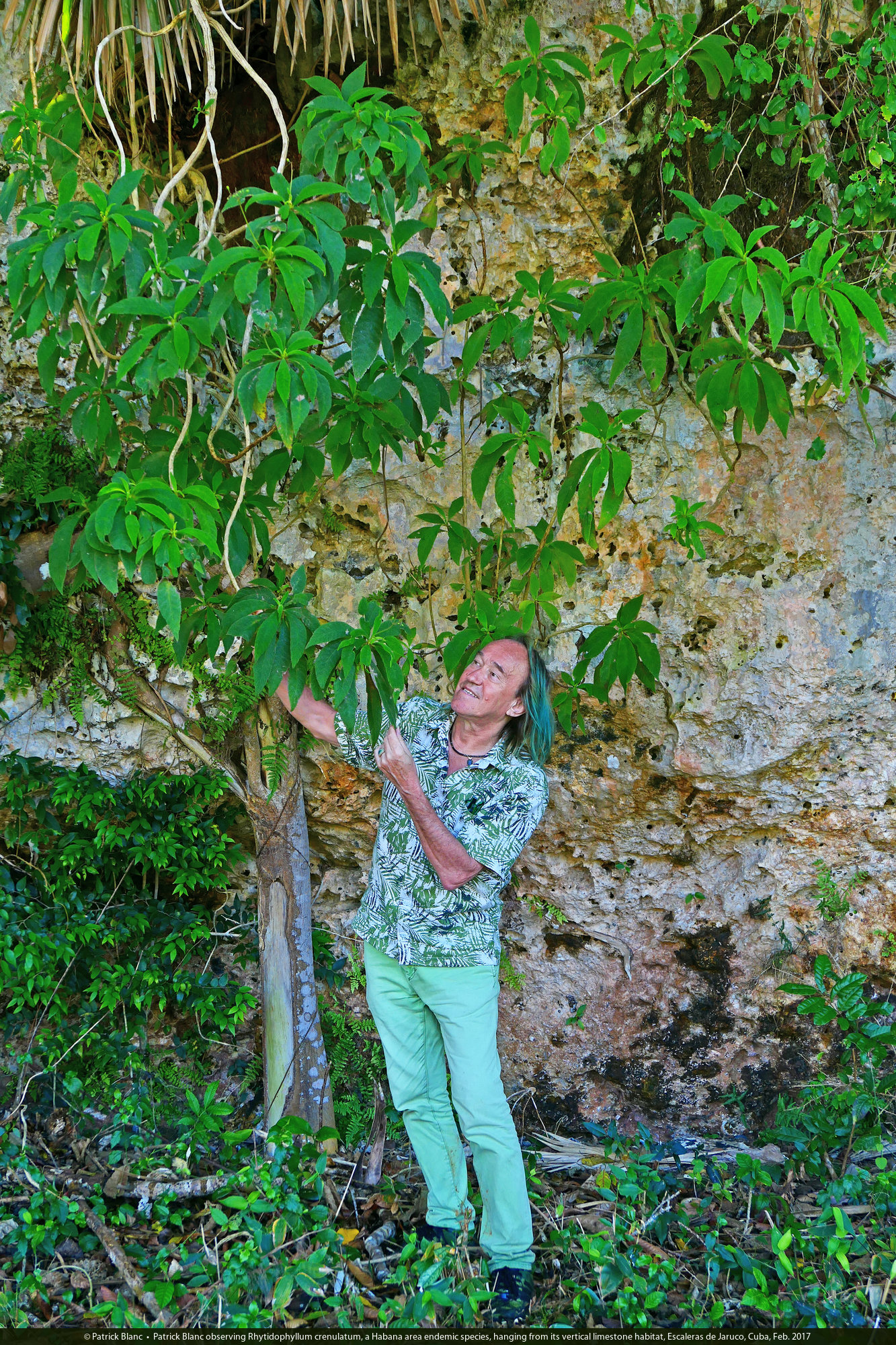Patrick Blanc under Rhytidophyllum crenulatum and Leucothrinax (syn.Thrinax) morrisii in their vertical limestone habitat, Escaleras de Jaruco, Cuba, Feb. 2017