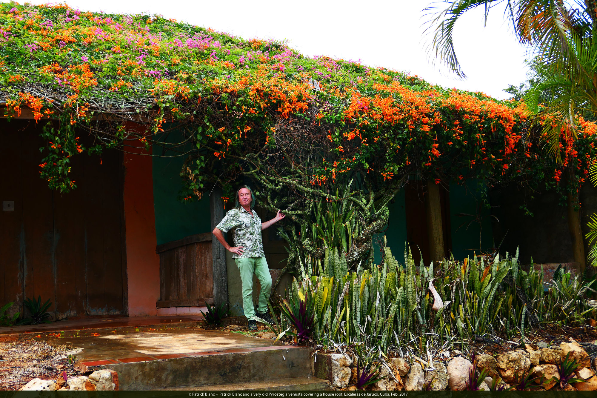 Patrick Blanc and a very old Pyrostegia venusta covering a house roof, Escaleras de Jaruco, Cuba, Feb. 2017