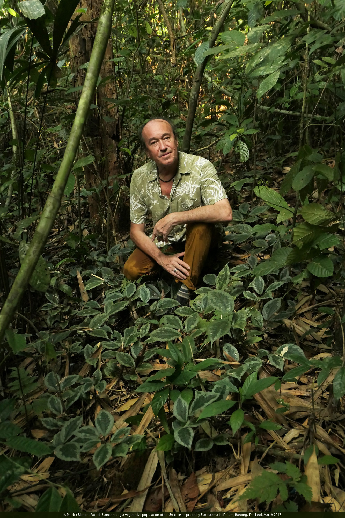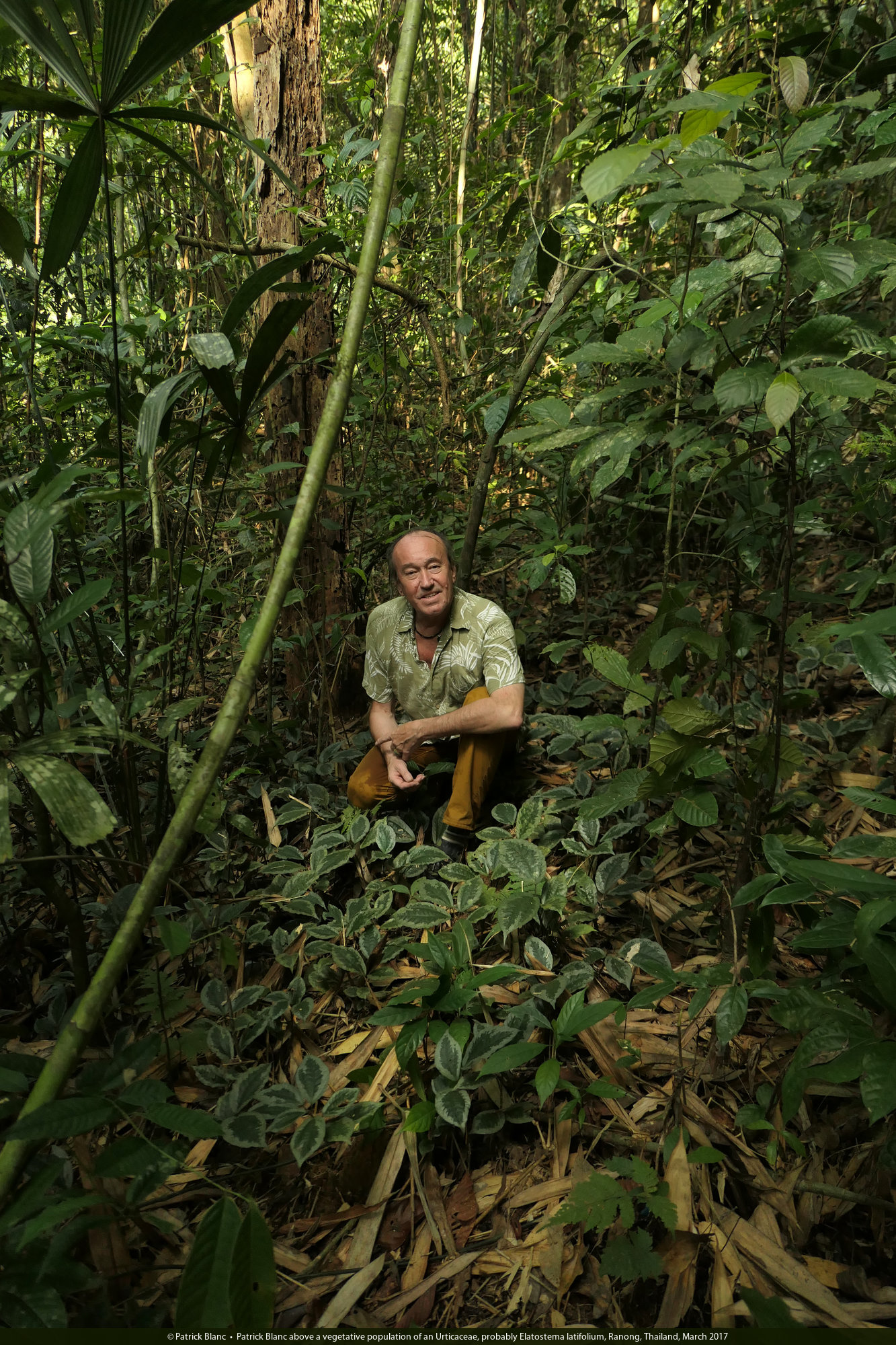 Patrick Blanc among a vegetative population of an Urticaceae, probably Elatostema latifolium, Ranong, Thailand, March 2017